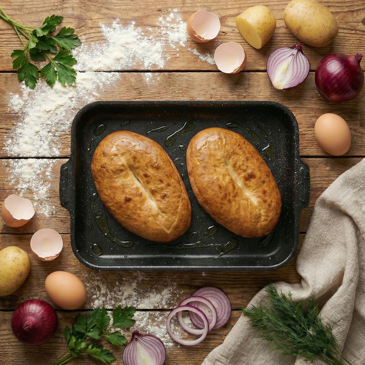 Вкусные и сытные домашние пироги с мягким тестом, румяной корочкой и сочной начинкой внутри. Для теста: ✅ молоко тёплое — 250 мл ✅ сухие дрожжи — 7 г (1 пакетик) ✅ сахар — 1 ст. л. ✅ соль — 1 ч. л. ✅ яйцо — 1 шт. ✅ растительное масло — 3 ст. л. ✅ мука — 450–500 г Для начинки: ✅ куриное филе или бедро без кости — 400–500 г ✅ картофель — 4–5 средних шт. ✅ лук — 1–2 шт. ✅ соль, чёрный перец — по вкусу ✅ сливочное масло — 30–40 г (кусочками внутрь пирогов) Для смазывания: ✅ яйцо — 1 шт. (или желток + 1 ст. л. молока) ▪️ В тёплом молоке растворяем сахар и дрожжи, оставляем на 10 минут до появления пенной шапочки. ▪️ Добавляем яйцо, соль, растительное масло, перемешиваем. ▪️ Частями подсыпаем муку и замешиваем мягкое, эластичное тесто. Оно должно чуть липнуть к рукам, но хорошо собираться в шар. ▪️ Перекладываем тесто в смазанную маслом миску, накрываем и оставляем в тёплом месте на 1–1,5 часа, чтобы оно увеличилось в 2 раза. ▪️ Куриное филе нарезаем маленькими кубиками. ▪️ Картофель чистим