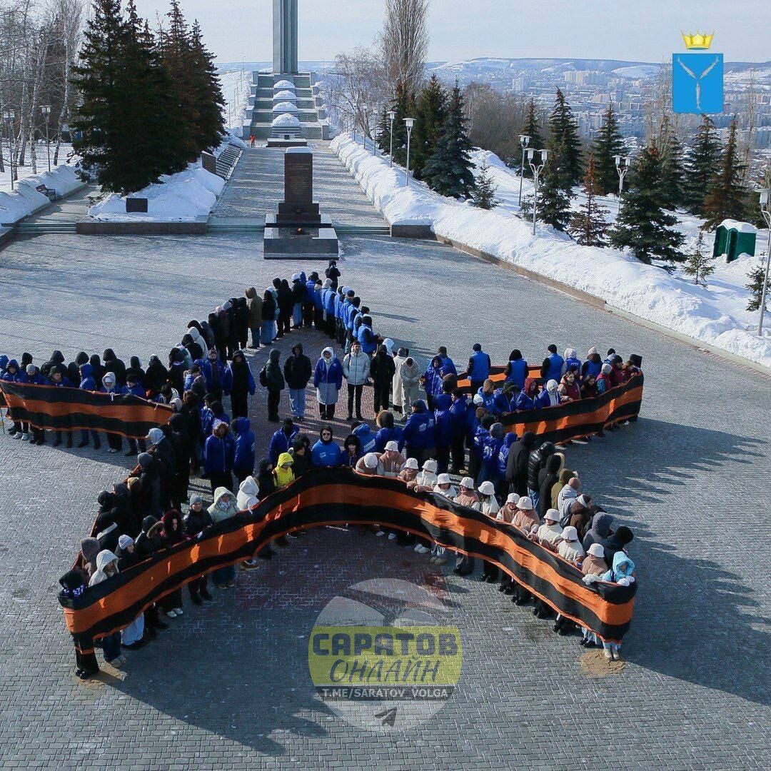 У мемориала «Вечный огонь» собрались более 200 студентов и активистов. Участники выстроились в форме звезды и развернули 60-метровую Георгиевскую ленту — как символ связи поколений. Акцию организовало региональное отделение «Молодой гвардии» при поддержке правительства области. ▫️САРАТОВ ОНЛАЙН ▪️ЭНГЕЛЬС ОНЛАЙН 📲 Мы в мессенджере MAX