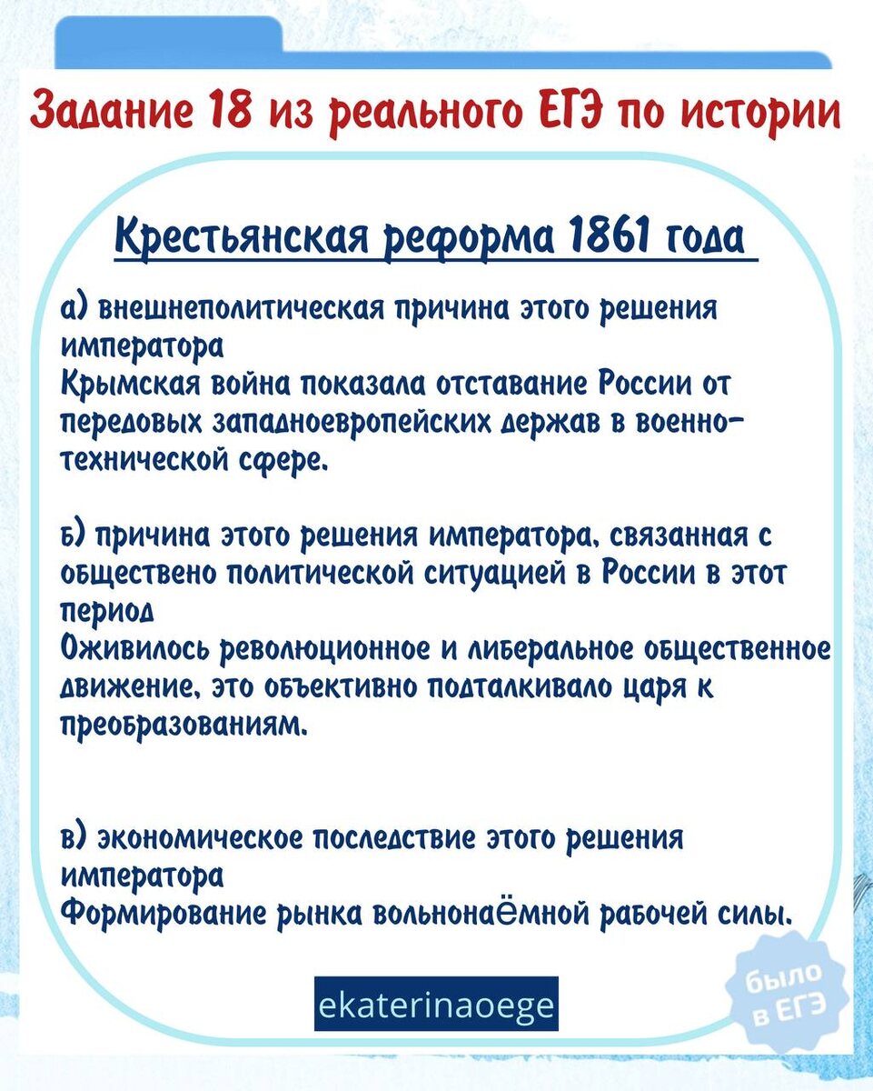 ! 📌ЗАДАНИЕ 1 Александр II, несмотря на то что большинство помещиков-дворян и высшей бюрократии выступали против отмены крепостного права и проведения других реформ, принял решение о проведении масштабных преобразований. Укажите: а) внешнеполитическую причину этого решения императора; б) причину этого решения императора, связанную с обществено политической ситуацией в России в этот период; в) экономическое последствие этого решения императора. 📌ЗАДАНИЕ 2 19 февраля 1861 г. Александр II подписал Манифест «О всемилостивейшем даровании крепостным людям прав состояния свободных сельских обывателей и об устройстве их быта» и «Положение о крестьянах, вышедших из крепостной зависимости». Укажите: а) влияние данного события на крестьянские волнения; б) последствие данного события для помещичьих хозяйств; в) последствие данного события для дальнейшей внутренней политики Александра II. Ловите карточки с ПСС на максимальные 🤝 первичных балла. Не жалейте 🔥 и запоминайте! P.S. Жду вас на
