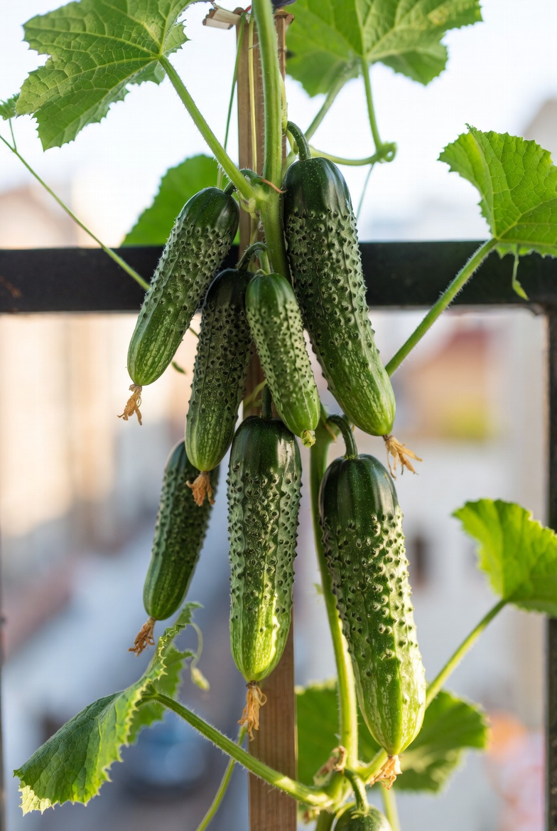 Свет. Огурцы любят солнышко, но многие современные сорта (как наши любимчики) неплохо растут и в полутени. Если балкон совсем тёмный, можно повесить фитолампу — они сейчас красивые, как обычные светильники, балкон не портят.