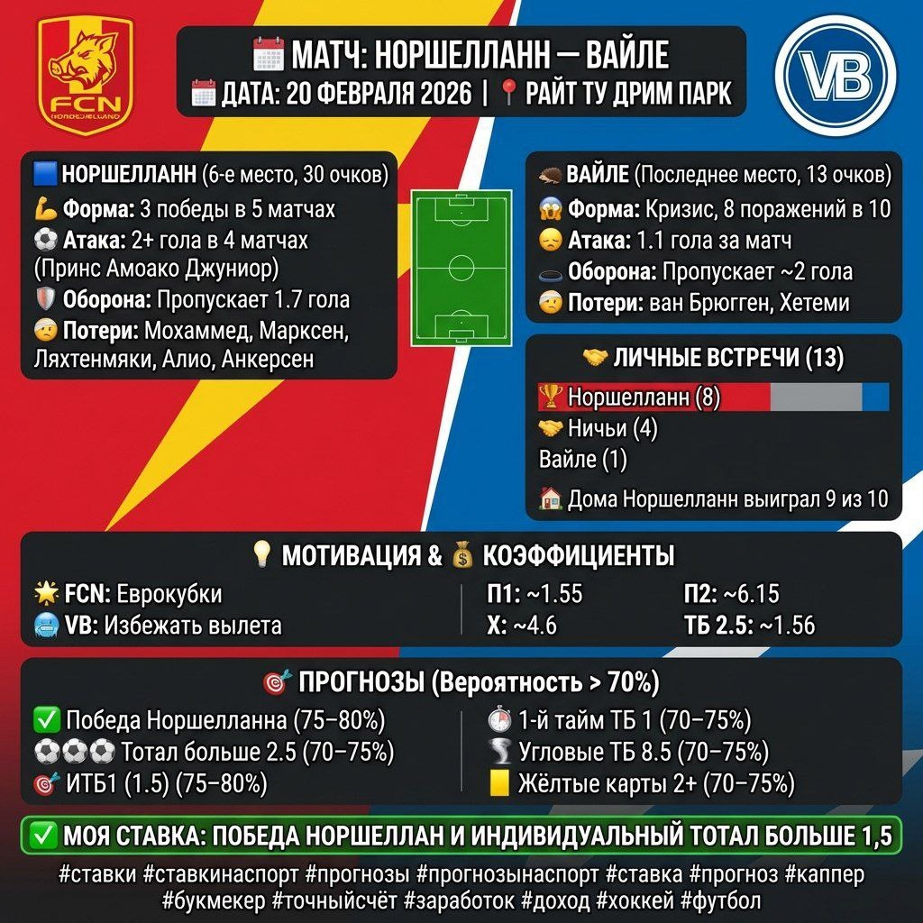 » ⚽️ 🗓 Дата: 20 февраля 2026 года 🔎 Тур: 21-й тур Суперлиги Дании 📍 Место: стадион «Райт ту Дрим Парк» (Фарум) 📊 Анализ команд 🟦 «Норшелланн» * Форма: 🔥 Отличная! 3 победы в последних 5 матчах чемпионата, включая выездную над «Копенгагеном». * Таблица: 6-е место с 30 очками за 20 туров. Команда активно борется за попадание в зону плей-офф. * Атака: 🚀 Очень мощная. Забивает не менее 2 мячей в последних 4 матчах. Ключевой игрок — Принс Амоако Джуниор (10 очков по системе «гол+пас»). * Оборона: 🛡️ Есть проблемы. Пропускает в среднем 1,7 гола за матч. В последних 6 играх не смогла сохранить ворота «сухими». * Кадровые потери: 🤕 Арафат Мохаммед, Эрик Марксен, Юхо Ляхтенмяки, Сулейман Алио (травмы), Петер Анкерсен (перебор жёлтых карточек). 🦔 «Вайле» * Форма: 📉 Кризисная. 8 поражений в последних 10 матчах. * Таблица: Последнее место с 13 очками за 20 туров. Ситуация критическая. * Атака: 😔 Слабая. В среднем 1,1 гола за матч. В последних 5 гостевых матчах пропу