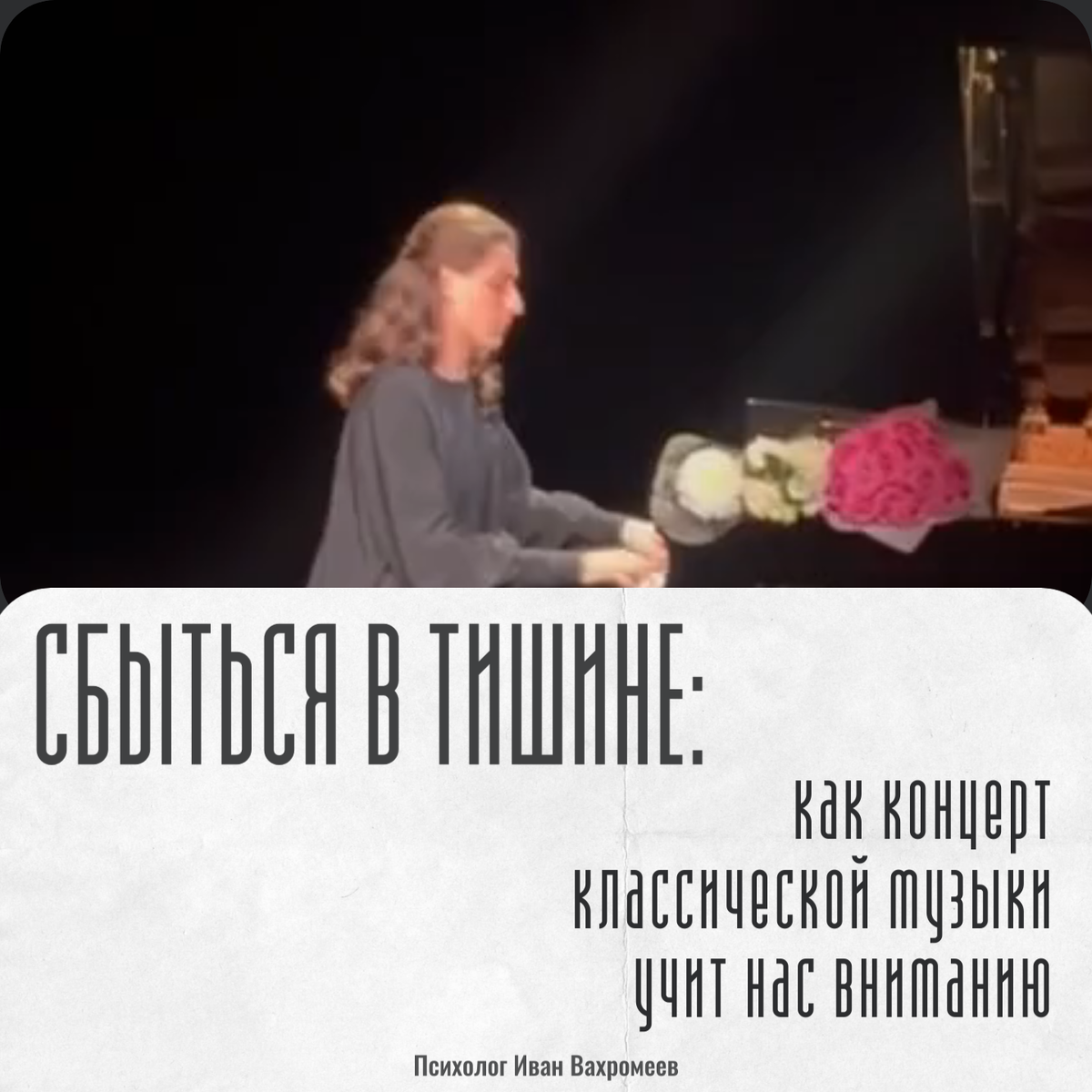 В продолжение поста об искусстве (https://t.me/ivanvahr_psy/437) отдыхать хочу привести пример из своего недавнего опыта, на этот раз связанного с музыкой. На этой неделе я был на выступлении небезызвестного пианиста Владимира Вишневского. Для меня это уже второй опыт посещения подобных концертов. Однако сейчас, помимо знакомства с новым для меня классическим репертуаром, я хочу провести параллель, касающуюся воспитания внимания и концентрации. Как я ни пытался сосредоточиться на выступлении, в первом отделении мысли упрямо блуждали — от далекого прошлого до неизведанного будущего. Ни Бах, ни Шопен не смогли удержать мое внимание. Но любопытно, что музыка Мориса Равеля ввела меня в состояние, близкое к полутрансу, из которого меня вывели лишь крики «Браво!» из зала. Второе отделение прошло иначе: я был гораздо более сконцентрирован и смог удерживать внимание продолжительное время. Возможно, сказался отдых в первой части, а возможно, мне просто ближе музыка Рахманинова, Чайковского и Пр