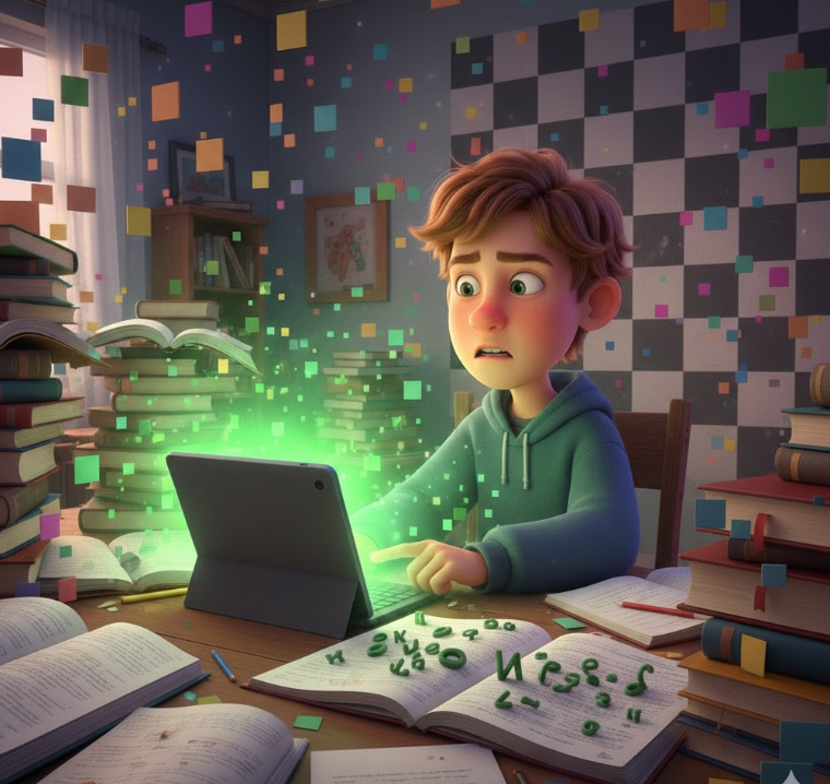 Макар сидел за столом, окружённый горой учебников и сиянием своего планшета. «Зачем учить правила, если нейросеть может всё исправить за меня?» — ворчал он, нажимая кнопку «Авторешение». Но вдруг экран мигнул ядовито-зелёным светом, и буквы в тетради начали извиваться, словно потревоженные змеи. Весь мир вокруг стал распадаться на крупные пиксели. Его кот, Кузя, недовольно мяукнул, когда пол под его лапами превратился в мелкую клетку из тетради по математике. В следующее мгновение Макар и Кузя провалились прямо в бездну между строк. Они летели мимо огромных знаков вопроса и восклицательных знаков, пока не приземлились на мягкий берег реки, текущей настоящими синими чернилами. На берегу стояло странное существо. Это была корова, но выглядела она ужасно: у неё было три рога, пять ног и хвост, растущий прямо из лба. «Это ты меня такой сделал!» — простонала Корова. Макар вспомнил вчерашнюю задачу, где он вместо «двух коров» получил «полторы коровы и ещё хвостик», решив пример наугад. К