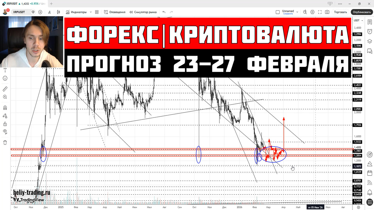 Прогноз Форекс и Криптовалюта на 23 - 27 февраля 2026: EURUSD евро/доллар, GBPUSD фунт/доллар, USDCHF доллар/франк, USDJPY доллар/иена, Индекс доллара DXY, USDRUB доллар/рубль, CNYRUB юань, Биткоин BTC, Эфириум ETH, Ripple XRP, Binance Coin BNB, Solana SOL, Toncoin TON, Индекс криптовалют TOTAL3, Золото XAUUSD, Серебро XAGUSD, Нефть BRENT, Природный газ, Фондовые индексы, S&P 500, Nasdaq, РТС, ММВБ, Инвестиции, Трейдинг, Технический и Фундаментальный анализ. Форекс:валютные пары EURUSD, GBPUSD и USDCHF откорректировались против тренда, тестируя сильные, исторические уровни поддержек и сопротивления. Образовавшаяся коррекция выглядит «рабочей» и не ломает доминирующий тренд.
