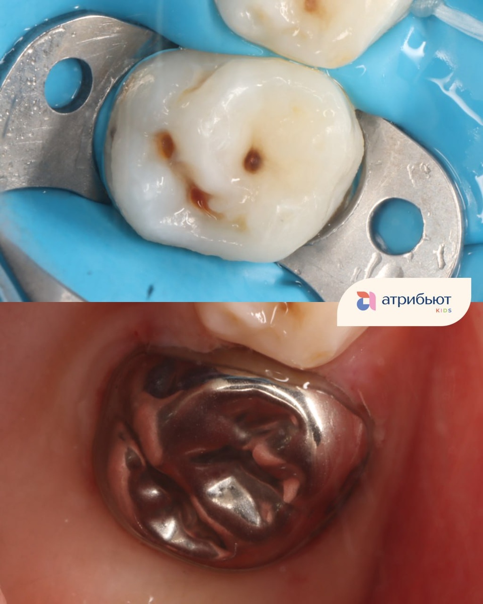 На приёме — маленький пациент с выраженным кариозным поражением жевательного зуба. На фото «до» заметно значительное разрушение тканей: объём дефекта уже не позволял ограничиться обычной пломбой без риска повторных проблем. 🔍 После детальной диагностики и полного удаления поражённых тканей было принято решение восстановить зуб металлической коронкой. В детской практике это надёжный способ сохранить зуб до его естественной смены. 🛡 Коронка перекрывает ослабленные стенки, берёт на себя жевательную нагрузку и защищает зуб от дальнейшего разрушения. Такой подход особенно важен при больших дефектах тканей. ✨ В итоге зуб сохранён, его функция полностью восстановлена, а риск повторного кариеса сведен к минимуму. Это стабильное и долговечное решение, которое даёт спокойствие и ребёнку, и родителям ⚕ Автор кейса: Наджафов Нахид Салманович — детский врач-стоматолог Atribeaute #atribeaute_kids 🌟Мы в МАКС
