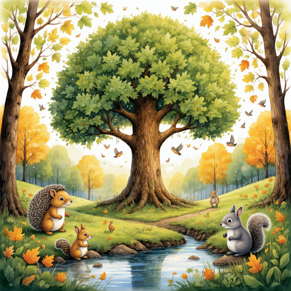 С тех пор как друзья стали хранителями леса, прошло лето, наступила золотая осень. Листья кружились в воздухе, словно разноцветные бабочки, а звери готовились к зиме. Но однажды утром Пушистик заметил, что листья на молодом дубке начали вянуть и опадать — раньше времени, когда остальные деревья ещё радовали глаз яркими красками. Ёжик тут же побежал к старому дубу. Тот выглядел печальным, его ветви склонились, а кора потускнела. Пушистик встревожился и позвал своих друзей. Вместе они обратились к сове Марте. — Что-то нарушило равновесие леса, — задумчиво проговорила сова. — Чтобы восстановить его, нужно найти источник проблемы. Старый дуб и молодой дубок связаны: если один страдает, это отражается на другом. Друзья решили отправиться в путешествие по всему лесу, чтобы выяснить, в чём дело. Они разделились: Когда все вернулись к поляне, сова Марта улыбнулась: — Вы справились! Вы не просто нашли и устранили проблемы — вы показали, что каждый уголок леса важен, и всё в нём связано. Теперь