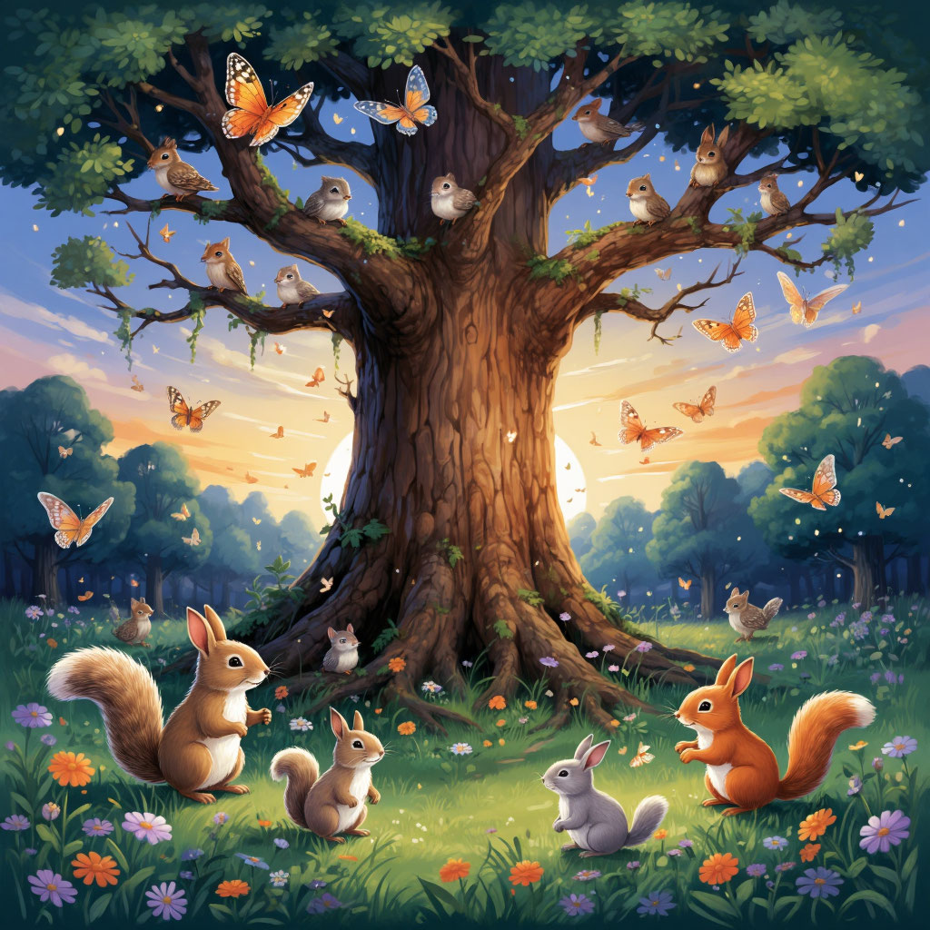 Прошли годы. Пушистик, Рыжуха, Ушастик и Полосатик выросли, но не перестали быть хранителями леса. Они передали свои знания и обязанности следующему поколению: весёлому бельчонку Пушистику‑младшему, шустрому зайчонку Ушастику‑второму, любознательной барсучихе Полосаточке и рыжей белочке Орешке. Старый дуб стал ещё величественнее — его крона раскинулась так широко, что могла укрыть от дождя целую поляну. А рядом с ним, уже почти вровень, стоял молодой дубок, который теперь называли Серебряным — за лёгкий серебристый отлив листьев в лунном свете. Однажды в канун летнего солнцестояния, когда ночь самая короткая, а магия природы особенно сильна, старый дуб созвал всех обитателей леса на поляну. Даже те звери, что жили далеко за холмами, пришли послушать его голос. — Пришло время открыть последнюю тайну, — прогремел глубокий, добрый голос старого дуба. — Я стоял здесь много веков, хранил лес, наблюдал за сменой времён и поколений. Но теперь я знаю: истинная сила леса — не во мне и не в волш
