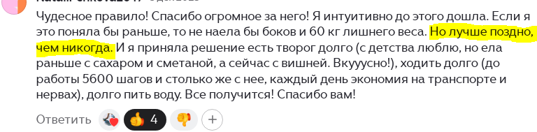 не наела бы боков и 60 кг лишнего веса". Читатели ставят лайки очень старой статье аж 5-ти летней давности. Мне, конечно, очень приятно, что те тексты живут и вызывают отклик, что люди считают их полезными для себя. И стала читать комменты к той старой статье, а там такая история (скопирую текст, т.к. может быть мелко и неудобно читать с телефона): Чудесное правило! Спасибо огромное за него! Я интуитивно до этого дошла. Если я это поняла бы раньше, то не наела бы боков и 60 кг лишнего веса. Но лучше поздно, чем никогда. И я приняла решение есть творог долго (с детства люблю, но ела раньше с сахаром и сметаной, а сейчас с вишней. Вкууусно!), ходить долго (до работы 5600 шагов и столько же с нее, каждый день экономия на транспорте и нервах), долго пить воду. Все получится! Спасибо вам! О чем же пишет читательница? Давайте вспомним, с каким настроением обычно начинаем худеть. А ещё вспомним, почему это начало имеет свойство очень много раз переноситься на очередной понедельник. Итак, нас