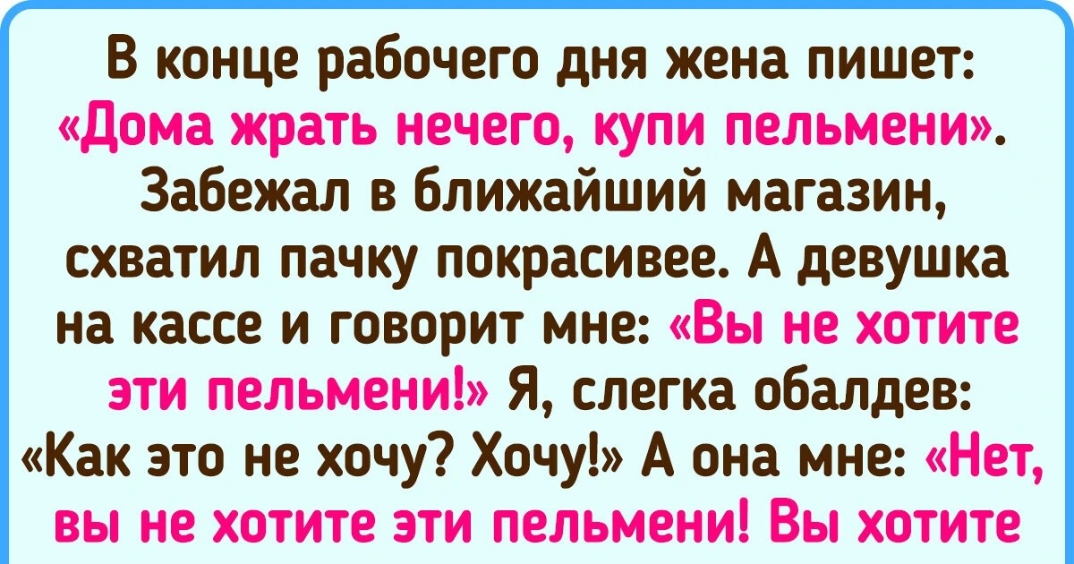 Зашел после работы в магазин за хлебом, подхожу к нужному отделу, а там бабулька крутит-вертит в руках буханку. Через несколько секунд меня увидела и просит: «Сынок, посмотри, дату. Хлеб свежий?» Я проверяю и говорю, мол, сегодня упакован. И тут она выдает: «Ой как хорошо, а то ведь мои куры только свежий клевать любят». В этот момент я забыл, зачем вообще в магазин пришел. В конце рабочего дня жена пишет: «Дома жрать нечего, купи пельмени». Забежал в ближайший магазин, схватил пачку покрасивее. А девушка на кассе и говорит мне: «Вы не хотите эти пельмени!» Я, слегка обалдев: «Как это не хочу? Хочу!» А она мне: «Нет, вы не хотите эти пельмени! Вы хотите другие пельмени. Эти дорогие!» У меня было ощущение, что меня прямым текстом назвали нищебродом. Я сказал девушке, что возможности мне позволяют выбирать пельмени по виду, а не по цене, а она объяснила: «У нас там на холодильнике с пельменями все ценники в куче стоят. Народ думает, что именно эти пельмени стоят дешево, а потом на кассе