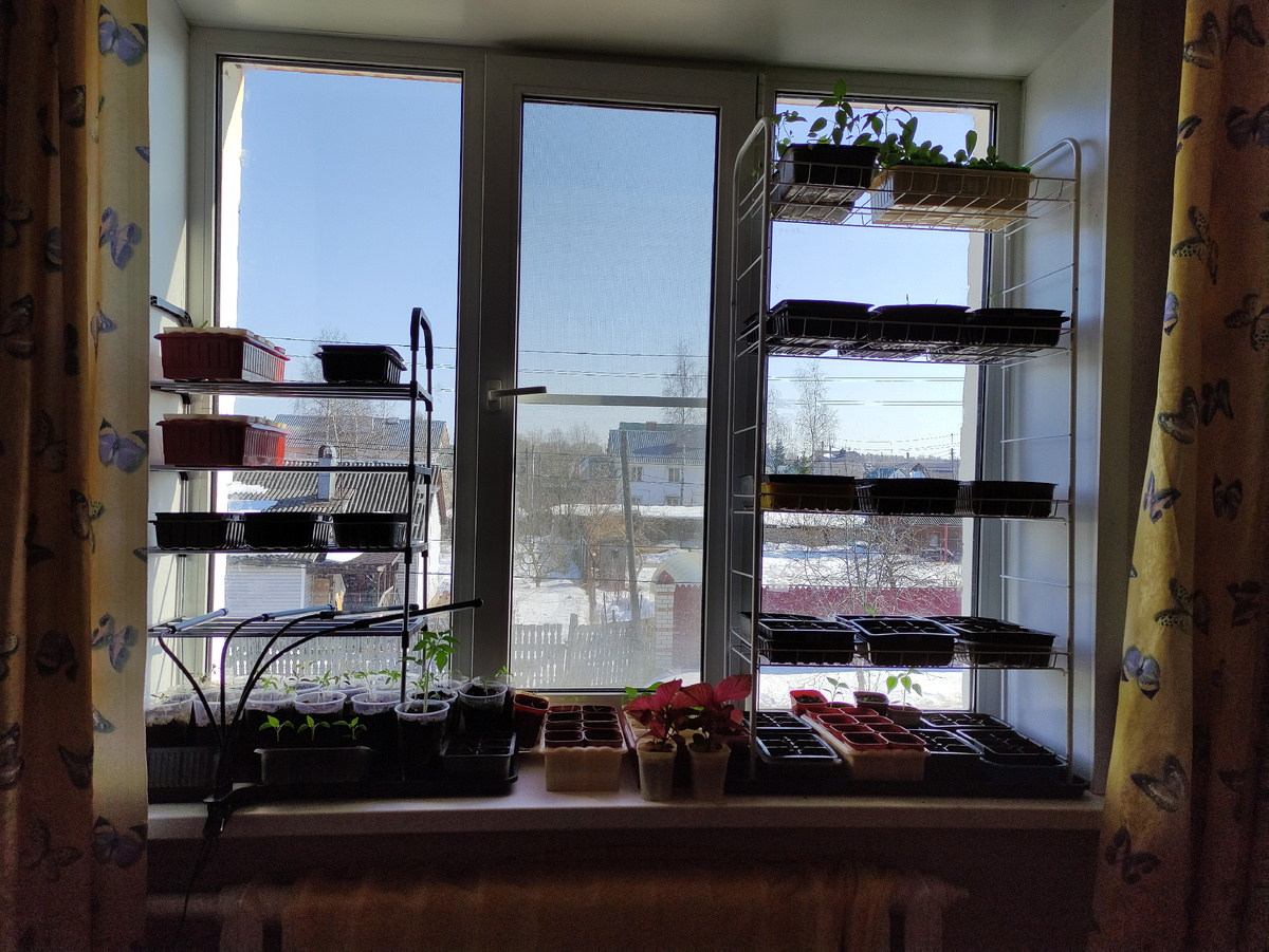 Так выглядит подоконник на данный момент, рассада цветов только-только прорастает под весенним солнышком: