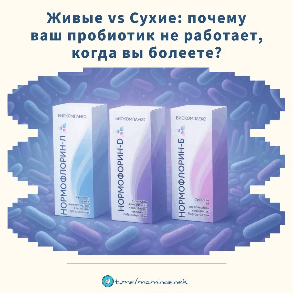 Но задумывались ли вы когда-нибудь, почему в острой фазе болезни «сухие» добавки из масс-маркета часто оказываются пустой тратой денег? Давайте разбираться в разнице между «спящими» и «живыми» бактериями. ❄️ Сухие пробиотики (Лиофилизаты) Большинство популярных препаратов — это бактерии, прошедшие заморозку и вакуумную сушку. Они находятся в состоянии анабиоза. В чем минус при ОРВИ? Чтобы «проснуться» и начать работать, такой бактерии нужно от 6 до 10 часов. Но в условиях интоксикации и воспаления в кишечнике — агрессивная среда. Большинство десанта просто не успевает активироваться и выводится транзитом. Вы платите за «спящие» клетки, которые не успевают вступить в бой. 🌱 Живые биокомплексы (Нормофлорины Л, Б, Д) Это жидкие концентраты, где бактерии уже находятся в активном состоянии. Но самое ценное здесь даже не сами бактерии, а метаболиты — продукты их жизнедеятельности, которые уже плавают в растворе. ❓Почему Нормофлорины — это «природный антисептик»? Мгновенный старт: Живым