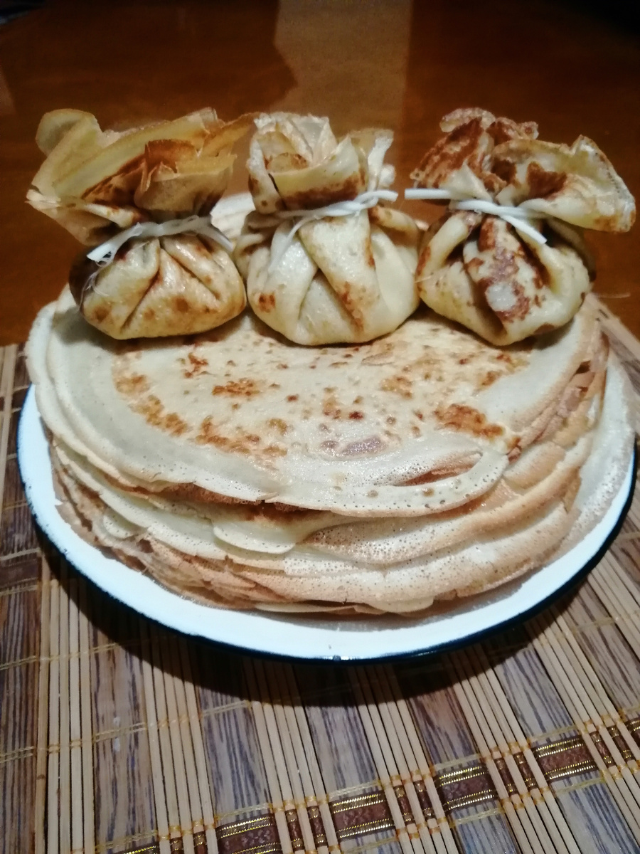 Обжариваем мелко нарезан.луковицу на растит. масле до подрумянивания.Затем добавляем 500г свино-говяжьего фарша и, помешивая и разбивая комочки фарша,готовим до выпаривания жидкости.Солим,перчим,добавляем щепотку куркумы и немного обжариваем. В первую часть картоф.пюре добавляем обжарен.фарш и хорошо перемешиваем.На середину блинчика кладём пару стол.л.начинки и собираем края в мешочек. Завязываем сыром"чечил-спагетти".