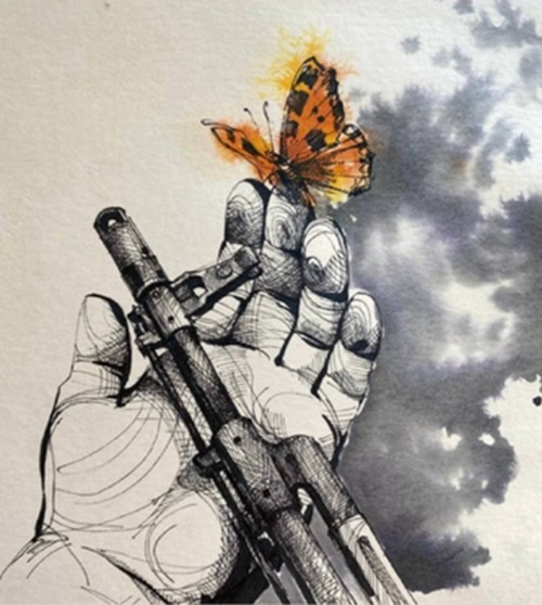 И даже торжествует. Следующая его издевательская картинка над добровольцами взята для рекламы его выставки в Перми, которая откроется завтра, 21 февраля. Мне случилось применение этой картинки Букши (не из Ставрополя) обнаружить ещё 8 июля 2022 года. Тогда Букша ещё не дозрел до рождения своего фирменного образа неполноценности России как недоведение рисунка до краёв, где рамка. Чем годится для насмешки доброволец? – Неумелостью и скорой смертью, сравнительно с профессинальными военными. Ну так первое осмеивается тем, что дуло автомата Калашникова касается ладони. А дуло накаляется от стрельбы. После пяти выстрелов взяться за дуло невозможно. Его и не касаются привычные к нему. Обещание скорой смерти – в поверии: «В христианской религии бабочка символтзирует бессмертие» (https://m.ok.ru/group/54125684719690/topic/68234914927946). А когда заговаривают о бессмертии? Когда хорошими словами сопровождают убитого при похоронах. 20 февраля 2026 г.