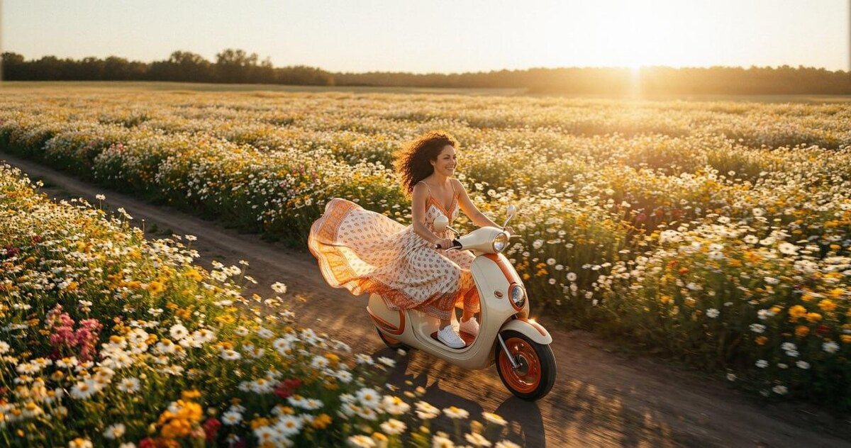 Модель: Nano Banana Сгенерировать🪄 Горизонтальный формат 21:9. Премиум обложка арт-журнала о фотографии и моде, fashion editorial, hyperrealistic, ultra sharp, 8K, cinematic, medium format look, museum-grade image quality, luxury advertising campaign mood. Россия, летний золотой час. Низкое солнце заливает поле мягким золотым светом. Узкая грунтовая дорога проходит через **бескрайнее поле суперкрасочных ромашек**, цветы крупные, каждый прорисован индивидуально, яркие, насыщенные, белые лепестки с ярко-желтыми сердцевинами, визуально «живые», плотный ковер до горизонта. **Динамика ветра:** ромашки слегка наклонены, лепестки едва колышутся, лёгкое motion blur в нижней части, создавая ощущение живого поля. Ветер подхватывает сарафан женщины — ткань струится, развивается по диагонали, контровой свет подчёркивает каждую складку и края материала. Поле и платье «дышат» вместе с воздухом, создавая эффект движения и свободы. Женщина средних лет на мотоцикле. Лицо строго соответствует реф