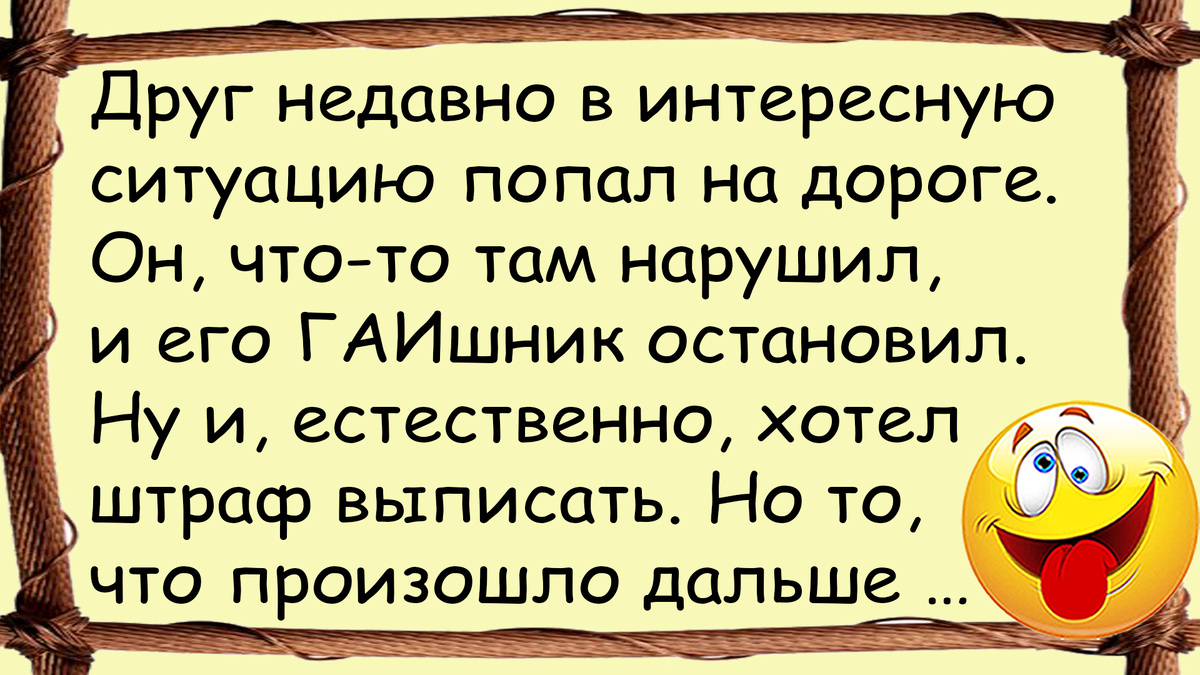 У меня друг есть, у которого машина есть. Еще, у него водительские права есть, но как он их получил, для меня до сих пор остается загадкой. Дело в том, что он ездит так, что только успевает штрафы платить. Я ему постоянно говорю, что пора уже за ум взять и перестать гонять. А то ведь, рано или поздно в какую-нибудь неприятную ситуацию попадет или прав лишат. Но он меня, почему-то, слушать не хочет. В общем, как гонял, так и гоняет. Говорит, что сейчас везде камеры поставили, а ГАИшников уже нигде нет, только на посту. Ну а где камеры стоят, он уже наизусть выучил. А их местоположение и на что они настроены, он узнал опытным путем. Но, в один прекрасный момент, когда он возвращался с дачи, ему «повезло» встретиться с настоящим ГАИшником. Естественно, остановил он его не просто так, и решил выписать ему очень даже внушительный штраф. Друг, понимая, что это не совсем хорошо, решил откупиться. И говорит: - А давайте всё на месте порешаем? Я заплачу. Здесь вроде никого нет, никто не видит.