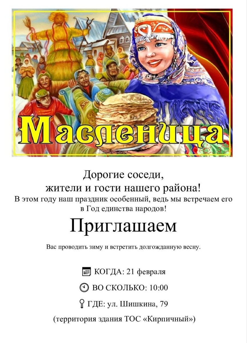 гуляньями! 📌В эту субботу, 21 февраля, жителей и гостей ТОС № 8 «Кирпичный» ждут на празднование Масленицы. Гулянья развернутся по адресу: ул. Шишкина, 79. (Территория здания ТОС) Начало – в 10 часов. 0+ 👍Гостям обещают тёплый приём, ароматные блины, задорные конкурсы и отличное настроение. Масленица – это не только повод полакомиться, но и возможность окунуться в атмосферу народных традиций, провести время с семьёй и друзьями, подарить себе яркие эмоции.