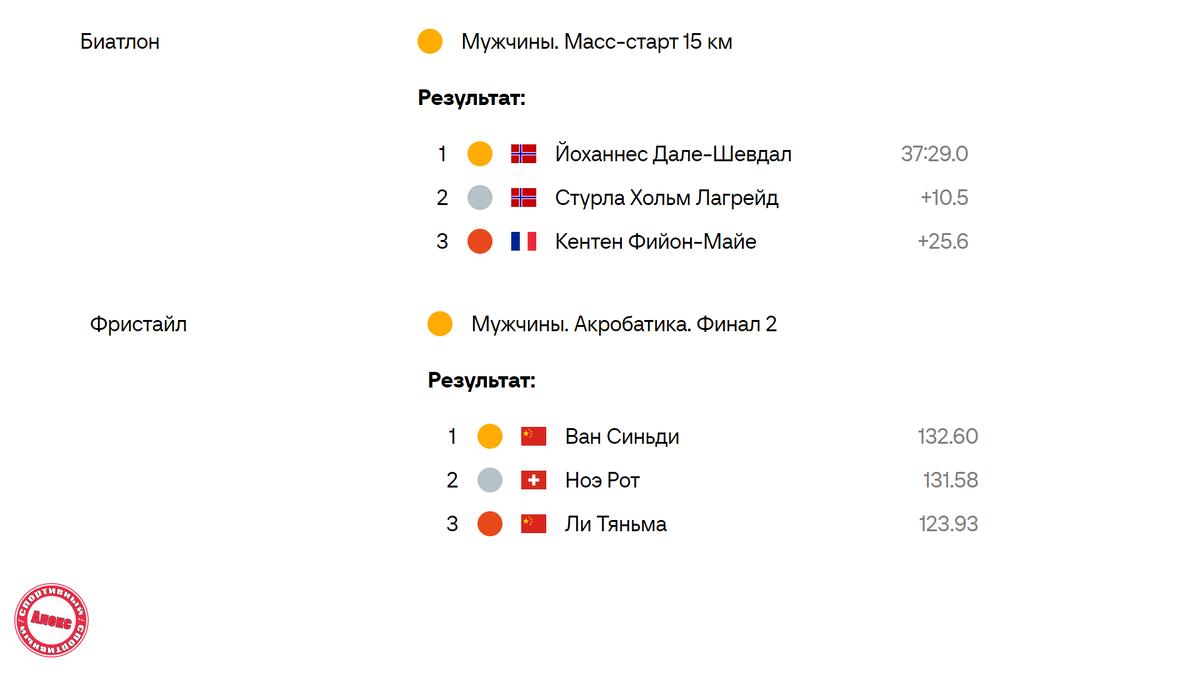 Привет, друзья. Сегодня завершился 14 день на зимней Олимпиаде. Смотрим результаты и в конце медальный зачёт, в котором установлен рекорд по золотым медалям. Мужчины. Масс-старт 15 км Йоханнес Дале-Шевдал из Норвегии занял первое место в масс-старте. Он преодолел 15-ти километровую дистанцию за 37 минут 29 секунды, не допустив ни одного промаха на четырех огневых рубежах. Вторым финишировал норвежец Стурла Холм Легрейд (отставание - 10,5 секунды; 1 промах), третьим - представитель Франции Кентен Фийон-Майе (+25,6; 4 промаха). Мужчины. Акробатика. Финал Ван Синьди из Китая стал победителем дисциплине "акробатика". Спортсмен показал результат 132,60 балла. Второе место занял швейцарец Ноэ Рот (131,58 балла). Третьим стал представитель Китая Ли Тяньма (123,93). Женщины. Ски-кросс. Большой финал Даниэла Майер из Германии стала победительницей в дисциплине "ски-кросс". Второе место в финальном заезде заняла представительница Швейцарии Фанни Смит, третьей стала шведка Сандра Неслунд. Женщины