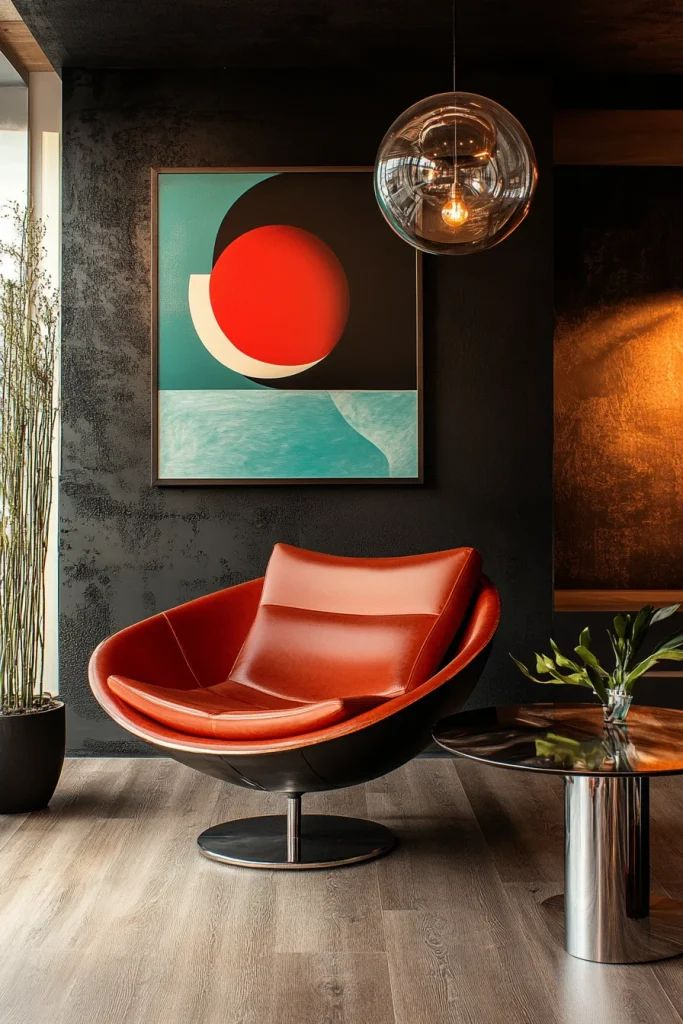 Минимализм: нейтральная база (белые стены, простая мебель) + один-два ретро-футуристических акцента (кресло, светильник). Баланс спокойствия и игривости.