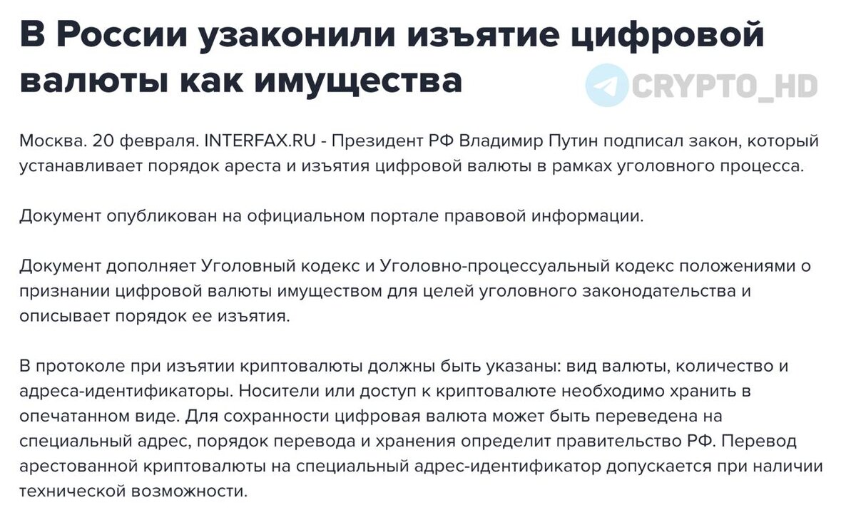 ❗️🇷🇺 Владимир Путин подписал закон об изъятии криптовалюты в рамках уголовных дел в РФ.