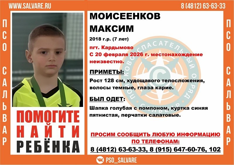 Максим Моисеенков пропал сегодня, 20 февраля, в пгт. Кардымово. Приметы: рост 128 см, худощавого телосложения, темные волосы, карие глаза. Был одет: голубая шапка с помпоном, синяя пятнистая куртка, салатовые перчатки. ℹ️ Любую информацию о пропавшем ребёнке просят сообщать по телефонам: 8 (4812) 63-63-33; 8 (915) 647-60-76; 102. Фото: ПСО «Сальвар» ⬇️ Подписывайтесь на «Рабочий путь», чтобы всегда быть в курсе! 💙 «РП» в MAX