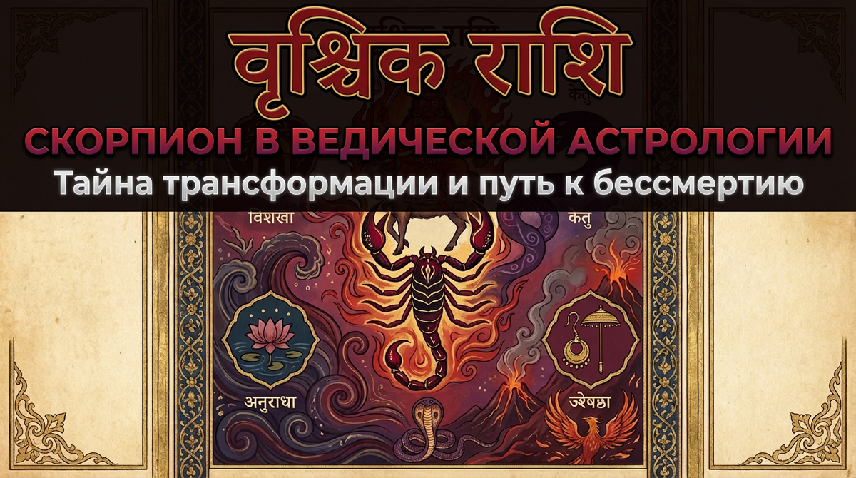В системе домов джйотиша Скорпион связан с принципом управления восьмым домом — домом смерти, тайн, наследства и оккультных знаний. Но смерть здесь понимается не как конец, а как переход, как сбрасывание старой кожи змеёй. Это дом, где материальное наследие предков встречается с кармическим наследием прошлого воплощения.