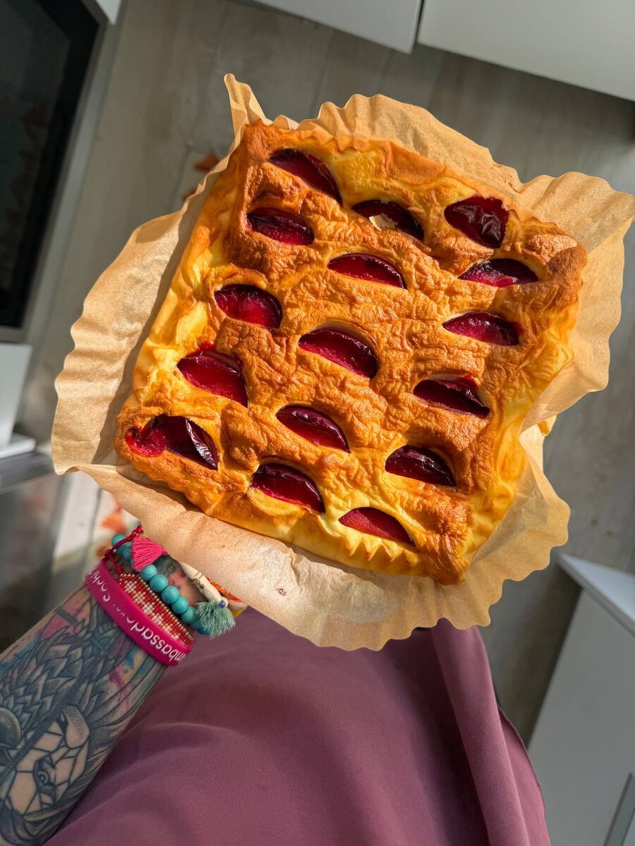 Придумала его вообще случайно. Просто смешала всё, что было, и получилось офигенно 😍 Готовлю уже раз пятый. Идеально на завтрак, идеально на перекус. Белок есть, сладость естественная, нет глютена, нет сахара. Короче, берём: ➖2 яйца ➖400 г мягкого творога ➖4 ст. л. рисовой муки Всё это закидываем в чашу блендера и пробиваем до однородности. Выливаем массу в форму для аэрогриля. Сверху кидаем сезонные фрукты или ягоды. У меня на фото слива, но вообще подойдёт всё что угодно. Я пробовала ещё с черникой и инжиром. Ставим на режим «пирог» примерно на 25 минут. Смотрите по своему аэрогрилю, но у меня за это время всё идеально схватывается. Фсё 🤷🏻♀️ Получается нежно, сытно, без добавленного сахара. Ест вся семья💃