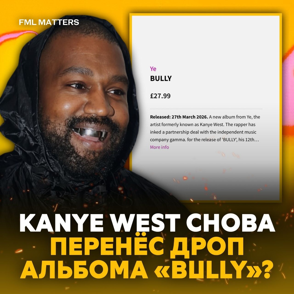 ‼️ KANYE WEST СНОВА ПЕРЕНЁС «BULLY» — УЖЕ ДЕВЯТЫЙ РАЗ! Альбом «BULLY», который изначально планировался на 30 января, снова отложили. По новым данным ритейлеров, релиз перенесли на 27 марта 2026 года. Это уже девятый перенос пластинки. 💀 FML MATTERS