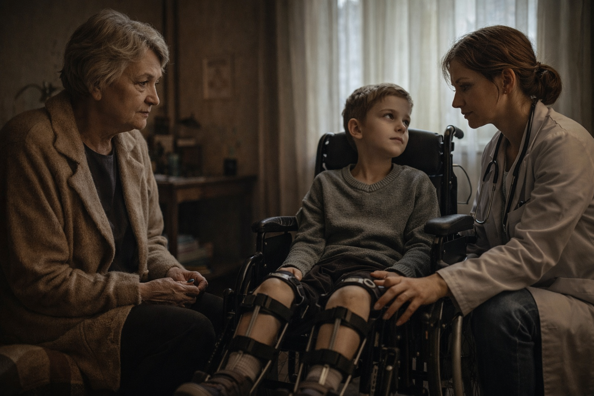 Лет двенадцати-тринадцати. Худой. Очень серьёзный. Он сидел в кресле так, как сидят дети, которые рано научились не мешать. Ноги были закреплены в ортопедических приспособлениях, руки лежали напряжённо, будто каждое движение требовало усилия.
