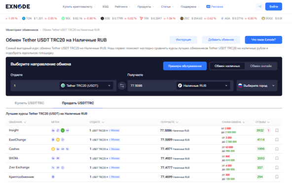 Для того чтобы наш обзор был максимально полезным и объективным, мы будем опираться на данные независимого мониторинга обменников криптовалют Exnode. Это сервис, который собирает в одном месте только проверенные обменные пункты, позволяя вам сравнить курсы и выбрать лучшее предложение, не рискуя своими средствами.