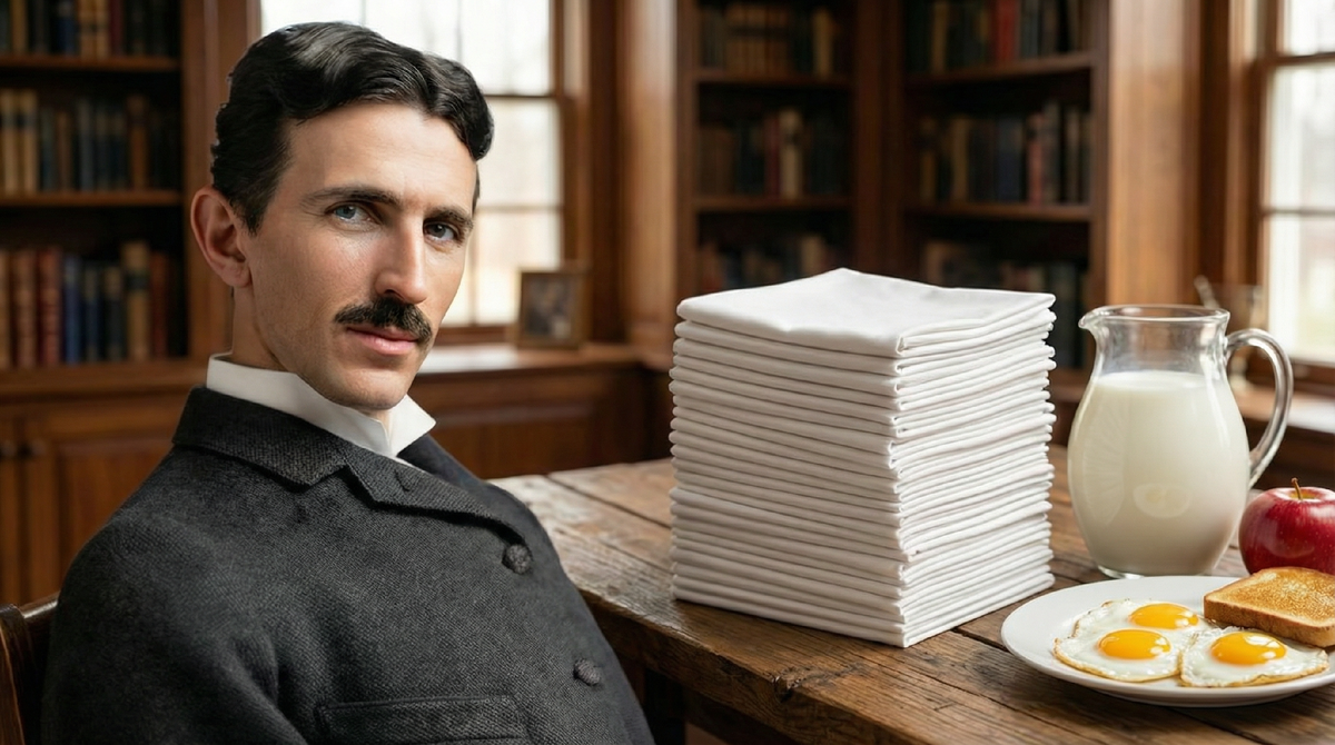 На столе обязательно лежала стопка ровно из 18 льняных салфеток. Цифра не случайная: Тесла был одержим числом 3 и любыми числами, на него кратными. Пока приносили еду, он методично полировал этими салфетками столовые приборы из серебра и хрусталя — уже и без того сияющие. К концу ужина вокруг него вырастала гора использованного полотна.