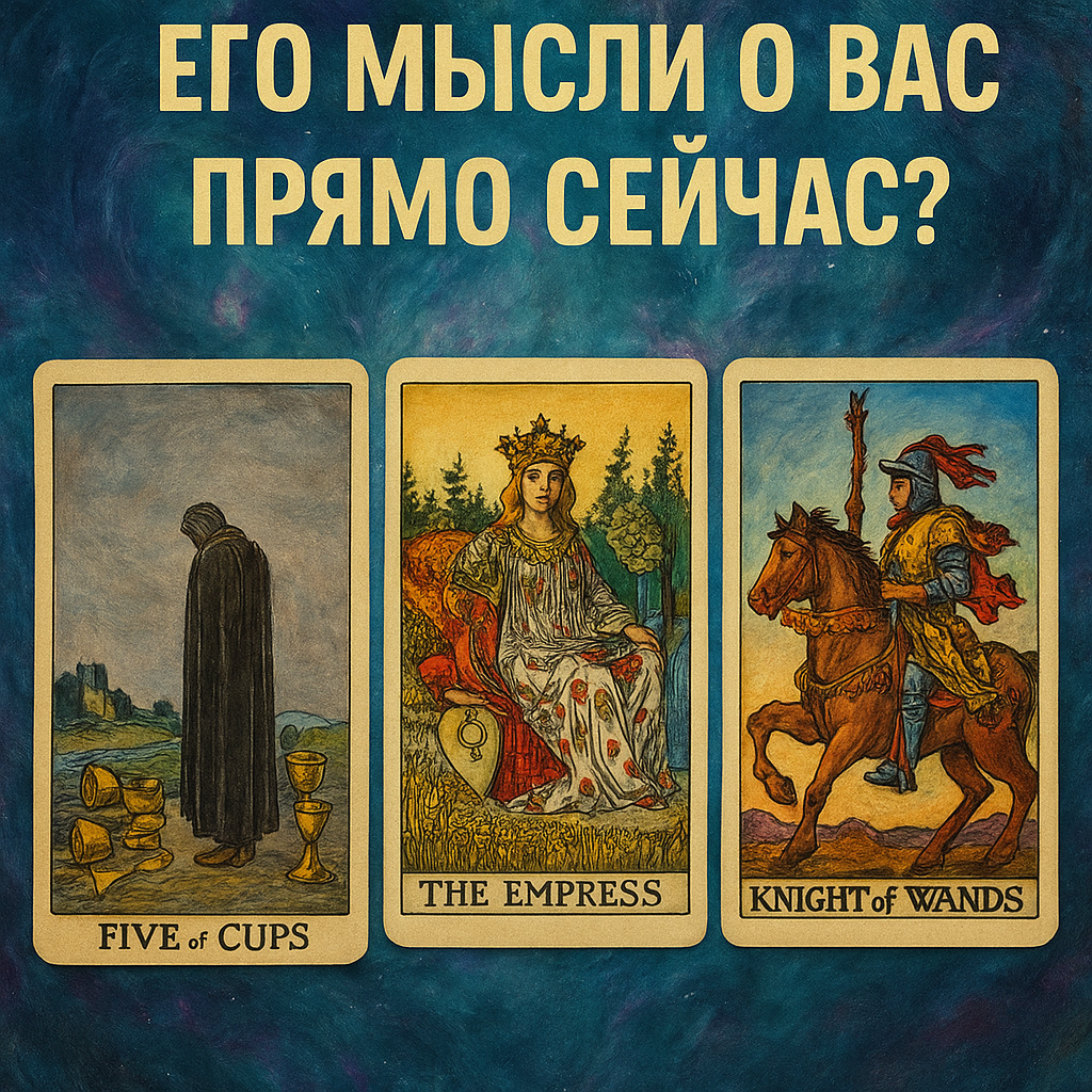 У него в голове вы сейчас как кадр из фильма, который он то ставит на паузу, то перематывает назад с мыслью: “Вот здесь надо было сделать иначе”. 5 Кубков запускает именно этот режим — не холодный анализ, а внутреннее “эх…”. Он мысленно возвращается к моментам, где, по его ощущению, что-то не сложилось: сказал не то, промолчал, исчез на день/неделю, недожал, не проявил инициативу, или наоборот — проявился неуклюже. И чем интереснее вы ему, тем сильнее он склонен это пережёвывать: потому что с людьми “так себе” никто не сидит ночами в голове, размышляя, где не дотянул. Эта карта часто показывает мысль из серии: “кажется, я упустил шанс”, даже если шанс на самом деле никуда не делся. Он может подозревать, что вы разочаровались, что у вас поменялось отношение, что вы уже “перелистнули”. И из-за этого в его мыслях появляется осторожная грусть: не обязательно драматичная, но такая, которая щёлкает по самолюбию. Тут же может быть и внутренняя ревность-фантом: он может представлять, что у вас