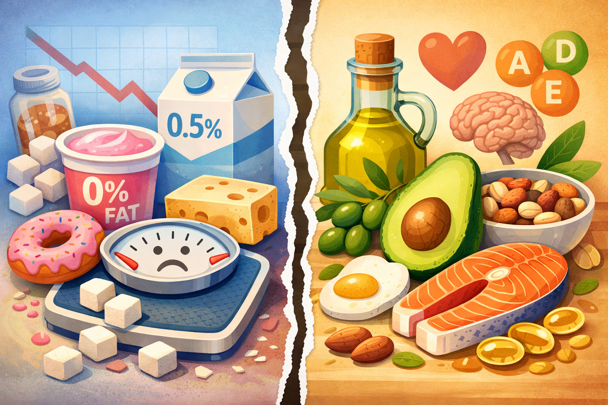 Если вы хоть немного интересовались здоровым питанием в последние двадцать лет, вы точно сталкивались с этой идеей: жиры — враги фигуры. Обезжиренные йогурты, молоко 0,5%, «лёгкие» сыры — всё это пришло именно из этого убеждения. И именно оно сделало нас менее здоровыми, а не более.