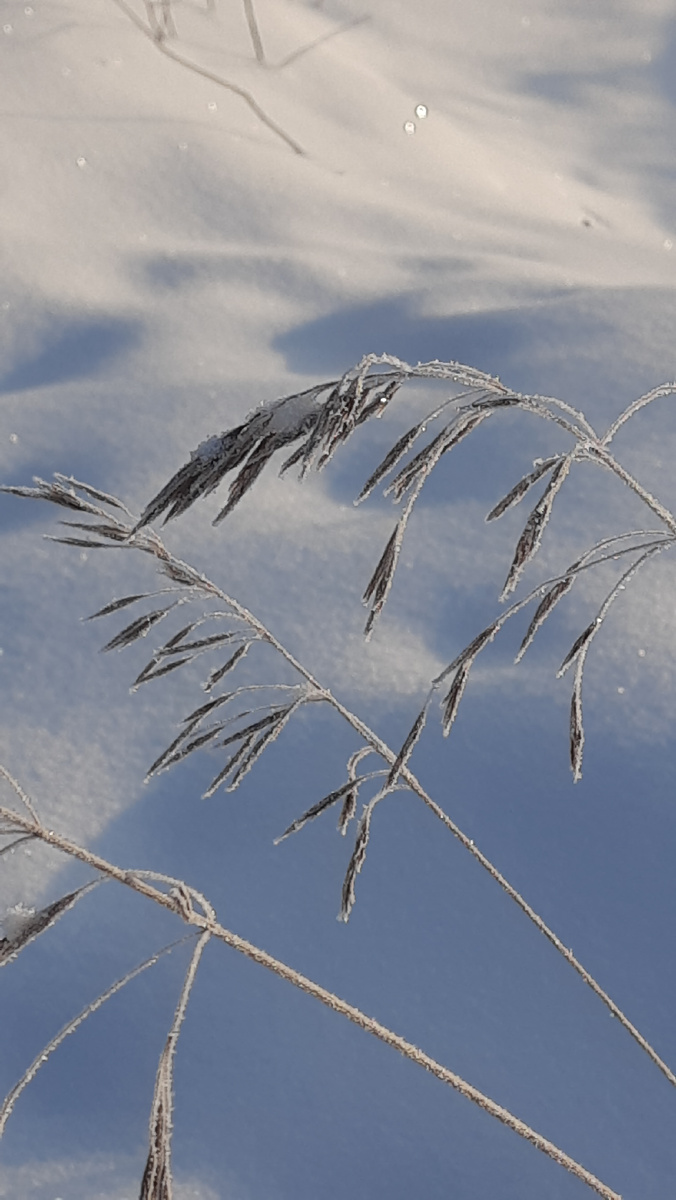 На сухой прошлогодней траве такие красивые ледяные отложения.