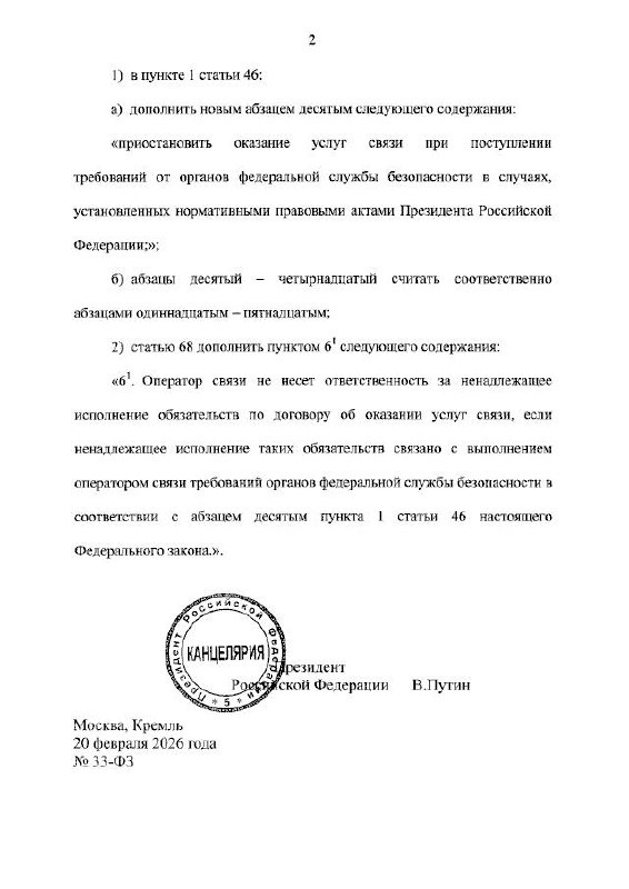 📝 Кратко: Президент РФ Владимир Путин подписал закон (Федеральный закон от 20.02.2026 № 33-ФЗ «О внесении изменений в статьи 46 и 68 Федерального закона „О связи“), который обязывает операторов связи приостановить предоставление услуг абонентам по требованию ФСБ. Читать далее 🔗 Читать оригинальную статью (ссылка) 📊 Источник: Habr ⏰ Время: 21.02.2026 04:34 📱 Другие каналы: 🪙 ВКрипту | 🎮 ВИгрухи | 🏎️ ВТачки | ✈️ ВТравелу #gadgets #гаджеты #технологии 🏆 Присоединяйтесь быстрее: Ключ к продуктивности раскрыт. Погрузитесь в детали на rise to fokus: | InsideAds Бесплатные подписчики