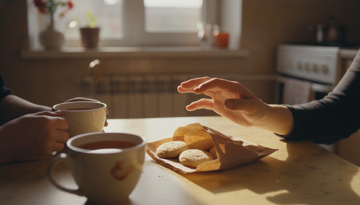 Она смотрела на меня так, будто я сказала что-то безумное. А я правда не понимала — что не так? Ну спросила я разрешения у самой себя. Я же в своей квартире. Нормально же. Нормально? Значит, сидим с Катькой на кухне. Все мое квартира, чайник, чашки. Восемь месяцев как моя. Катька рассказывает про отпуск, я слушаю, киваю, чай стынет. На столе стоит пачка печенья. «Юбилейное», обычное, за сорок рублей пачка в Пятерочке. Я хочу печенье. Протягиваю руку. И говорю: «Кать, можно я возьму?» Катька замолкает на полуслове. Смотрит на меня. Потом на печенье. Потом снова на меня. «Что?» «Ну, печенье. Можно?» Пауза. Длинная. Неудобная. «Оля. Это твоё печенье. В твоём доме. Ты у кого сейчас спросила?» Я засмеялась. Отмахнулась. Сказала «ой, привычка». Катька не засмеялась. Катька смотрела на меня так, как смотрят на человека, который ходит с осколком стекла в ладони и говорит: «Не, не больно, нормально, просто немного кровит». Потом я думала об этом весь вечер. Лежала в кровати и прокручивала. Пече