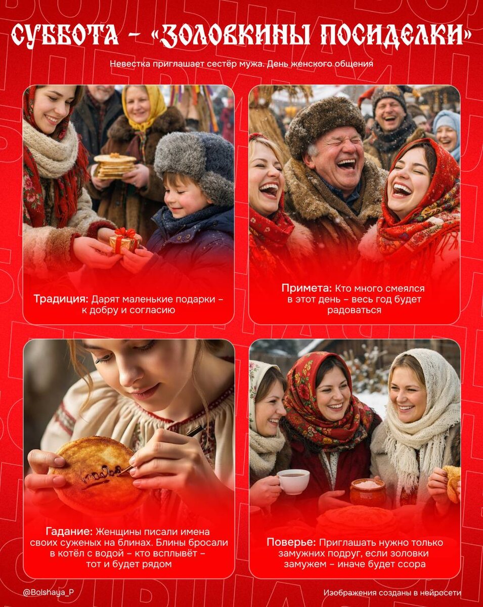 В этот день молодая жена приглашала сестер мужа, дарила подарки и щедро угощала. Одинокие девушки гадали на суженого и обсуждали возможных женихов, замужние — беседовали о быте и хозяйстве. Если еще не успели посидеть с подругами, то сегодня самое время ☕️ ❤️ Подписаться | Предложить новость | Дать «буст» | Мы в MAX