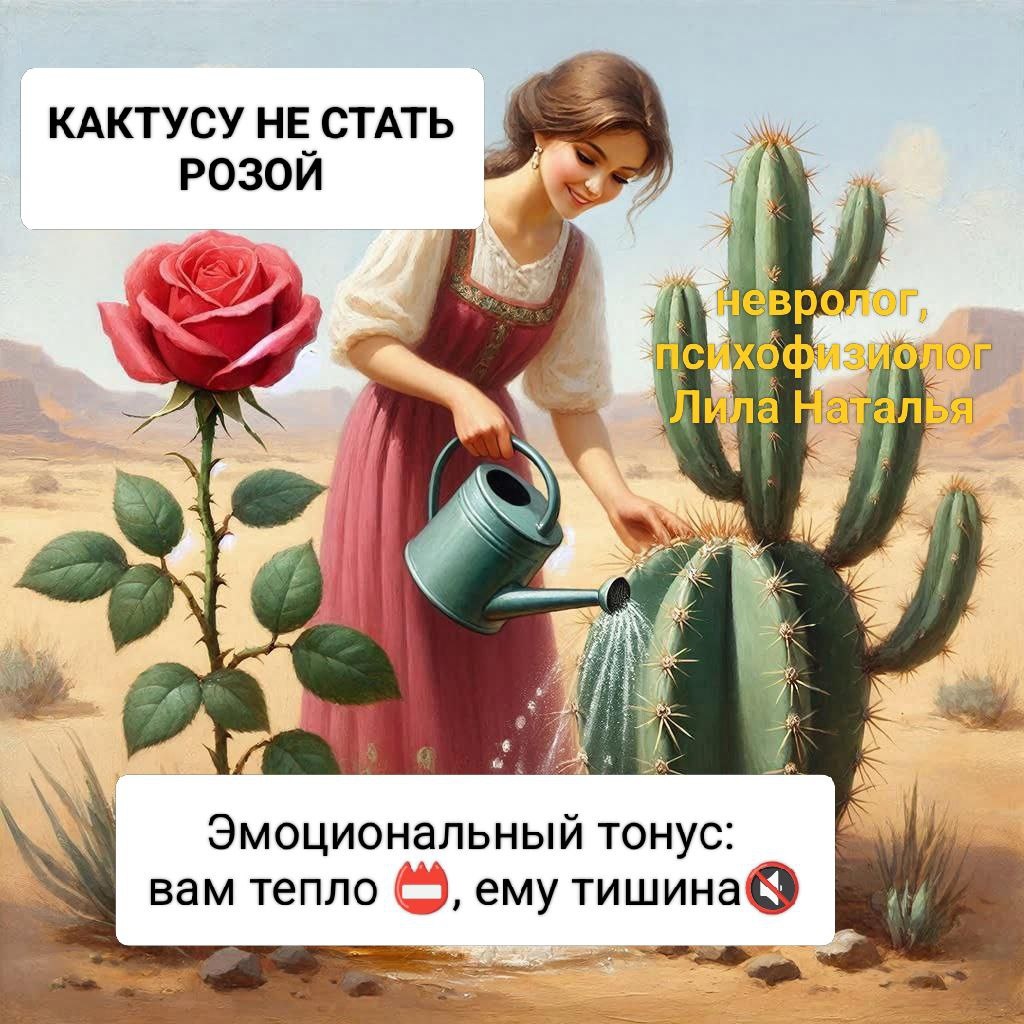 Для женщин, которые любят сильно. В нашем теле есть невидимая, но очень важная система — вегетативная нервная. Она регулирует пульс, дыхание, давление и… эмоциональный тонус. У неё две главные настройки: симпатика — это про активность, бодрость, при её активации мы легко загораемся, тянемся к людям, нам нужно движение и эмоции, и есть парасимпатика — она отвечает за восстановление. Когда она доминирует, мы замедляемся, нам нужно меньше контактов, мы бережём энергию. Так вот, что происходит в отношениях: "Розы" рождаются с активной симпатикой. Им нужно тепло, обмен, забота. Они цветут, когда их любят, и увядают без внимания. Их эмоциональный тонус требует движения — как сердцу нужен ритм. "Кактусы" рождаются с доминантой парасимпатики. Их нервная система настроена на энергосбережение. Им комфортно в покое, в тишине, наедине с собой. Им не нужно много эмоциональных обменов — это их истощает. Если вы роза — ваша потребность в тепле и близости не каприз. Это ваша природа. Ваш эмоциона