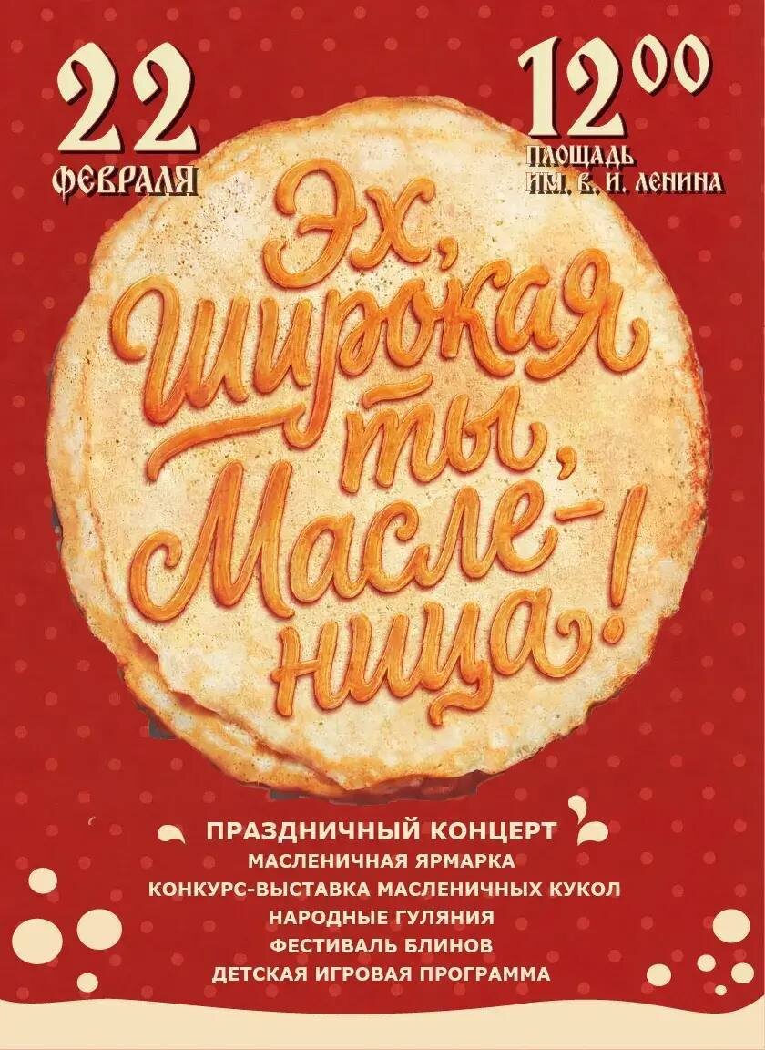 ! 💃Уже в это воскресенье, 22 февраля, в 12.00 на центральной площади развернутся народные гулянья – с размахом, отличным настроением и сытными угощениями. 🎤Праздничный концерт с народным колоритом не оставит никого равнодушным – подпевать и пританцовывать разрешается всем! 🥞Фестиваль блинов покорит любого гурмана. Такого разнообразия – кружевных, тонких, дрожжевых, с пылу с жару, классических, со сметаной и экзотическим вареньем – вы больше нигде не найдете. ⚡В ходе мероприятия будет проходить конкурс-выставка масленичных кукол. Уровень мастерства участников вас точно поразит! 💪И какой же праздник Масленицы без старинных русских забав? Все желающие смогут проверить себя на силу и ловкость! 🚸Не останутся без внимания и дети – для них подготовили насыщенную игровую программу, где они получат возможность проявить себя и зарядиться положительными эмоциями. 🌟И, конечно же, в ходе всего мероприятия вас будет радовать масленичная ярмарка – торговые ряды впечатлят своим ассортимен
