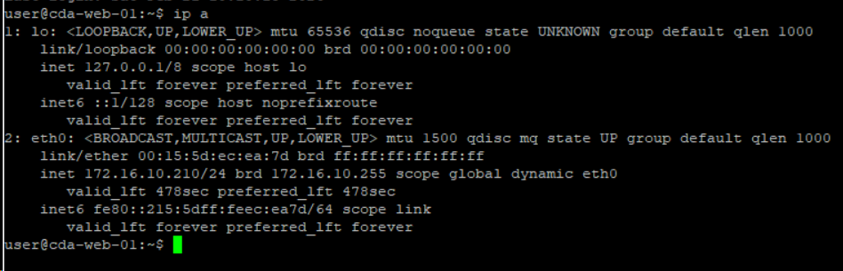Установили Debian 12 в минимальной установке с нахлобучкой SSH сервер, теперь настроим необходимый минимум ip a Как видим у интерфейса eth0 ip 172.16.10.210. Теперь для удобства настроек можем зайти по SSH под заданной учетной записью при установке. УЗ root по умолчанию отключена для SSH. Повысим наши права до root user@cda-web-01:~$ su -