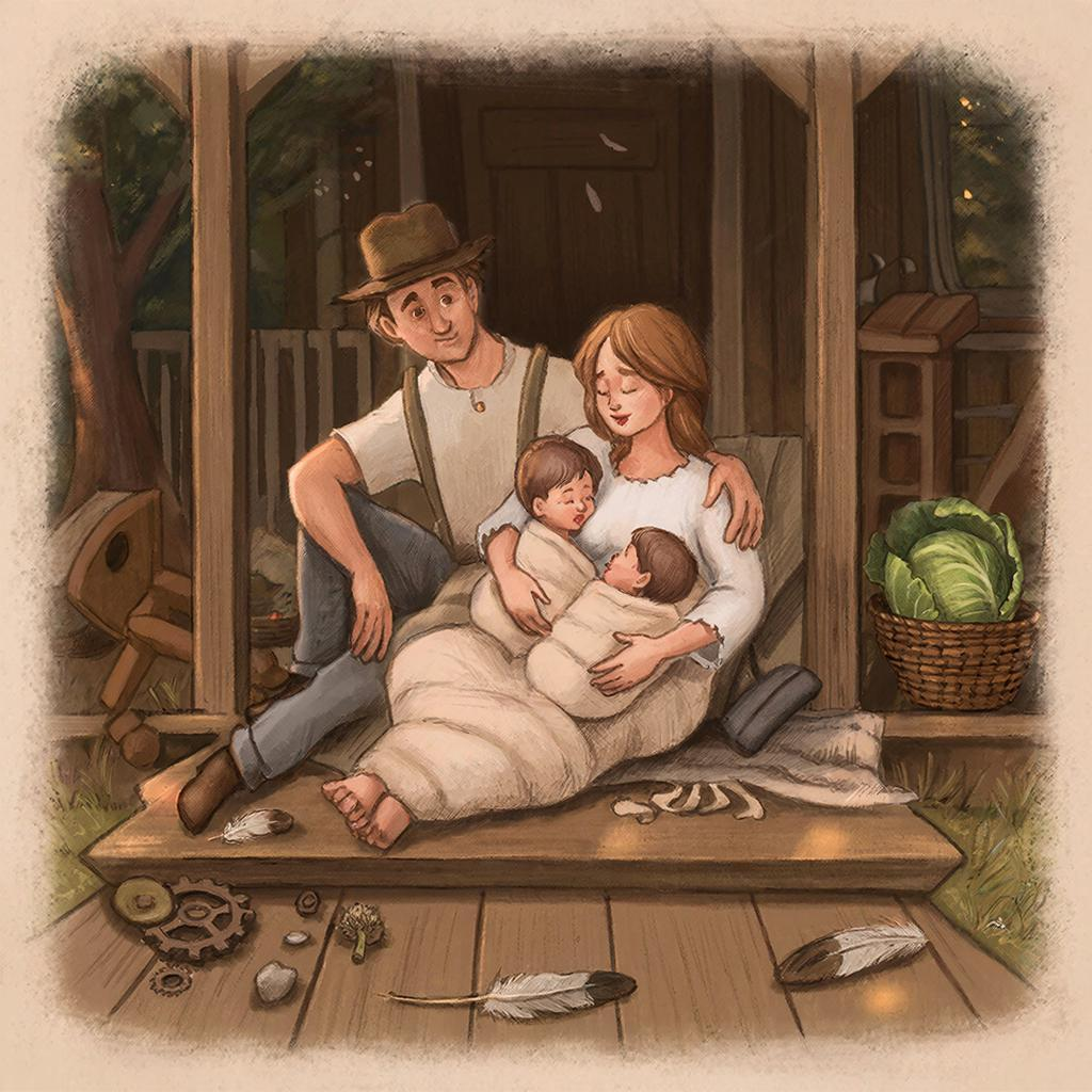 Прогулка десятая из цикла «Счастье в Чащобах», в которой мы с Милой наконец-то встретили тех, кого так долго ждали, а я понял, что даже мои бездонные карманы не готовы к такому счастью Тот день я запомню навсегда. Даже если проживу ещё столько же, сколько до этого, — всё равно. Началось всё рано утром. Мила вдруг села на кровати и сказала спокойным голосом: — Бриль, пора. Я открыл глаза и почему-то сразу всё понял. Никаких вопросов, никаких «чего пора». Просто вскочил, натянул штаны, и через минуту уже летел через три холма к тётушке Вире. Хорошо, что я тогда всё же сходил к ней договориться. Хорошо, что она обещала быть наготове. И хорошо, что я запомнил дорогу — ноги сами несли. — Тётушка Вира! — закричал я, влетая в её двор. — Началось! — Привет папаша, — спокойно сказала она, хватая заранее собранную корзинку. — Беги обратно, я следом. И дыши, а то позеленел уже. Я побежал обратно. Дышал. Старался. А дальше был самый длинный день в моей жизни. Я сидел на крыльце и слушал, что проис