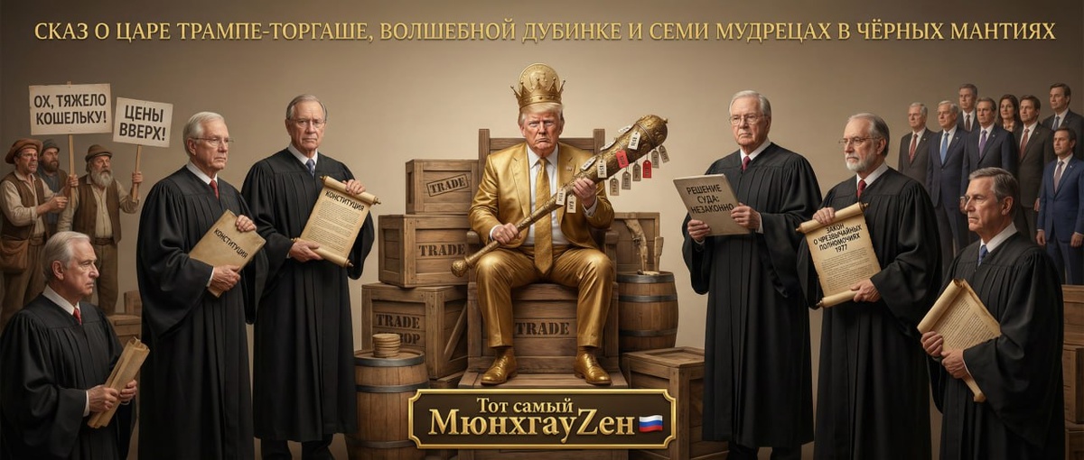 ) 🚨 Сказ о Царе Торгаше, волшебной дубинке и семи мудрецах в чёрных мантиях 📜 Историческая тень: Всякий царь, да не всякий над законом Бывало и на Руси, что цари законы переступали. Да только Иван Васильевич, хоть и Грозным прозывался, а и то приказных людей слушал. Американские же цари, видать, возомнили себя выше отцов-основателей. Да только закон — он как дубина: если по нему бить — он и служит, а если его переламывать — он по рукам и бьёт. Мораль сей сказки для мира сего: 1. Закон — не дышло. Как ни крути, а Конституция — она и в Америке Конституция. Нельзя на пустом месте чрезвычайное положение объявлять, чтоб налоги собирать. Царь Торгаш это теперь на своей шкуре испытал. 2. За всё платит потребитель. Сколько экономисты из Института Катона ни считали, а выходило одно: пошлины бьют не по заморским купцам, а по карману простого люда. Исследования семь раз перепроверяли — результат тот же. А Царь всё кричал, что "за иностранцев платят". 3. Нельзя наобещать с три короба.