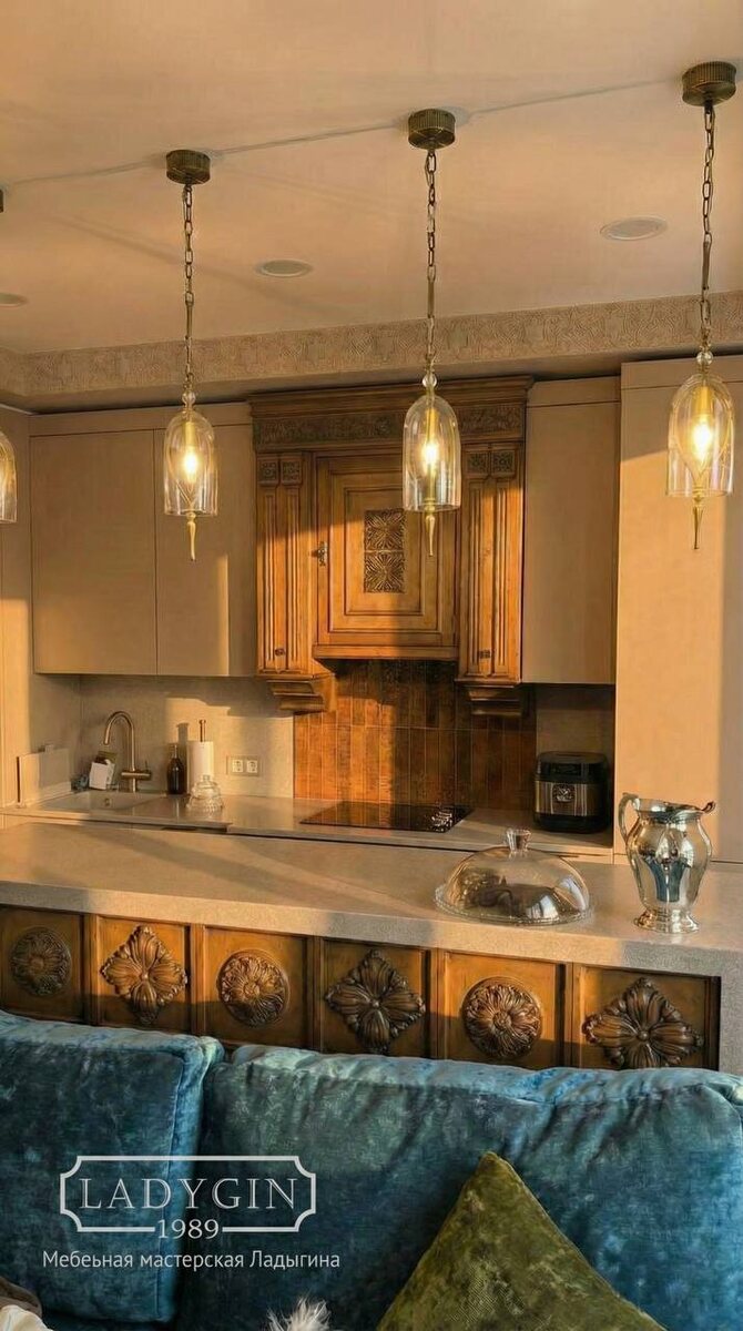 Центральная часть вытяжка и ящик духового шкафа выполнен нами в классическом стиле в цвете орех ♥️