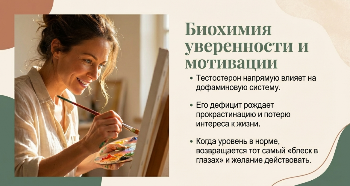 Андрогены участвуют в регуляции дофаминергических путей. Их дефицит может сопровождаться снижением инициативы, мотивации и интереса к привычной деятельности. При коррекции гормонального фона у части людей отмечается возвращение внутреннего «драйва» и способности к долгосрочному планированию. Когнитивные функции