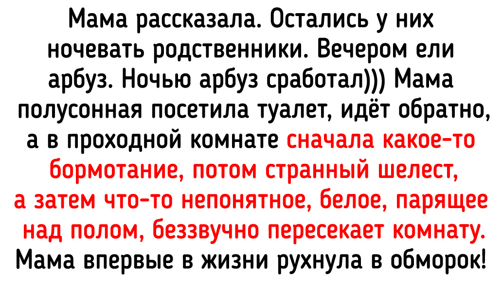 Тёща брата как-то осенью ночевала на даче одна. Вокруг никого, неподалёку деревенское кладбище… И вдруг слышит — вокруг дома кто-то ходит. Ходит и громко дышит. Набралась смелости, выглянула посмотреть, что там за НЕХ такая, а это оказалась лошадь. Из деревни притопала. Просто на участке тогда ещё не было забора… © Просто мысли вслух / Dzen Служил в армии и иногда дежурил в штабе. 3 этажа, все кабинеты закрыты и опечатаны. И вдруг ночью слышу крики и маты, а потом тишина. По камерам никого нет. Через какое-то время снова маты и что-то падает. Встал, всё обошёл — никого. Короче, всю ночь был на измене, волосы от страха шевелились. Никому не рассказывал, чтобы не засмеяли. На следующем дежурстве всё повторилось. Оказалось, на 3-м этаже был кабинет офицера, который любил играть в компьютерные игры. Дома жена не разрешала, и он говорил, что дежурит, а сам всю ночь играл на компе. Оставаться ночью в штабе было запрещено, и он просил коллег, чтобы его закрывали и дверь опечатывали, а в туале
