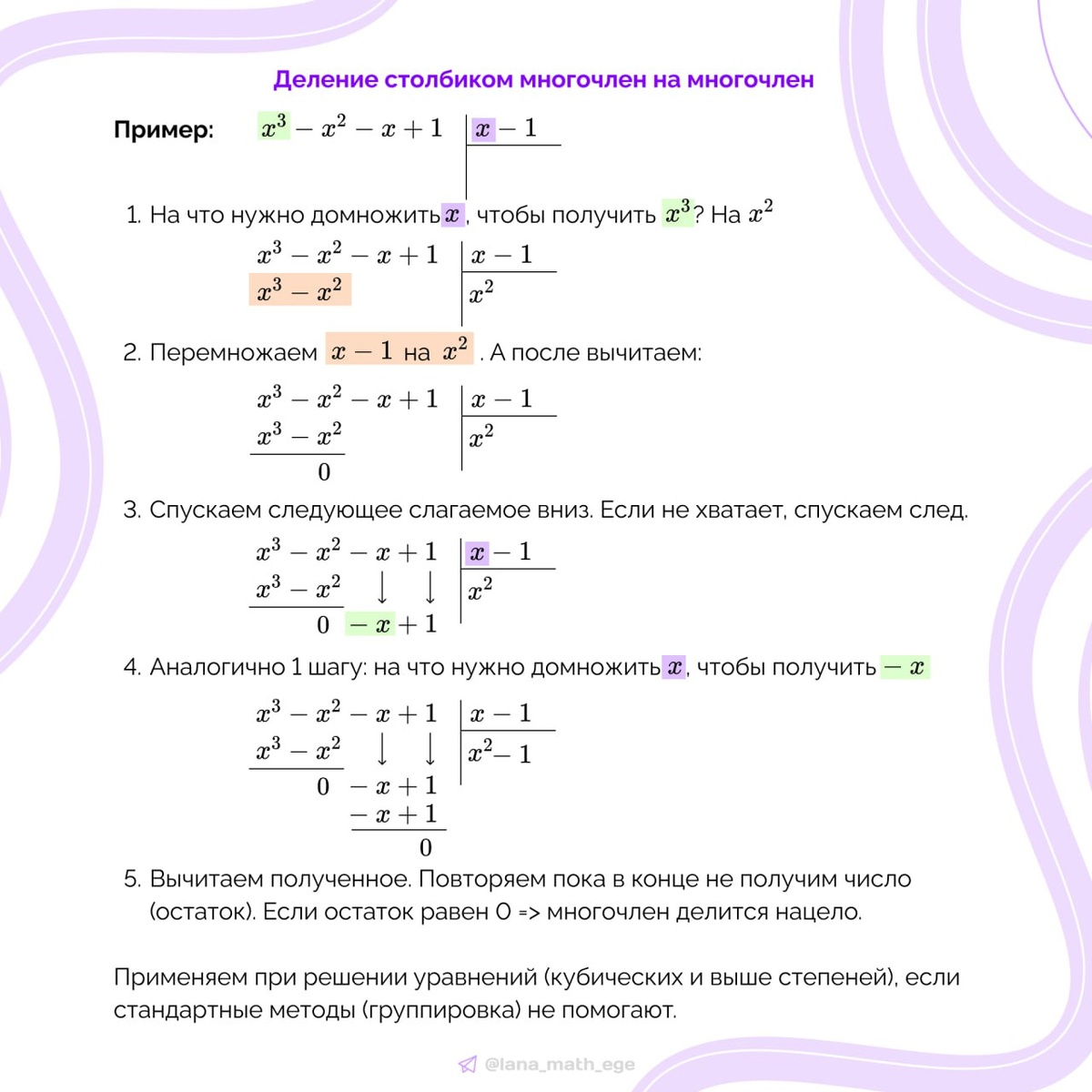 ? Если вы решаете задания №15 на неравенство или №18 на параметры, то эта ситуация точно вам знакома. В таком случае вам на помощь приходит деление столбиком (аналог схемы Горнера) 1️⃣ Вы подбираете один из корней уравнения (перебирайте среди небольших чисел по типу 1, -1, 2, -2 и пр.) 2️⃣ Делите ваше уравнение на выражение "х — (ваш корень)" И работаете по следующей методичке 💾 Пользуетесь ли вы схемой Горнера или делением столбиком? 💾 — да! 🗿 — что это?
