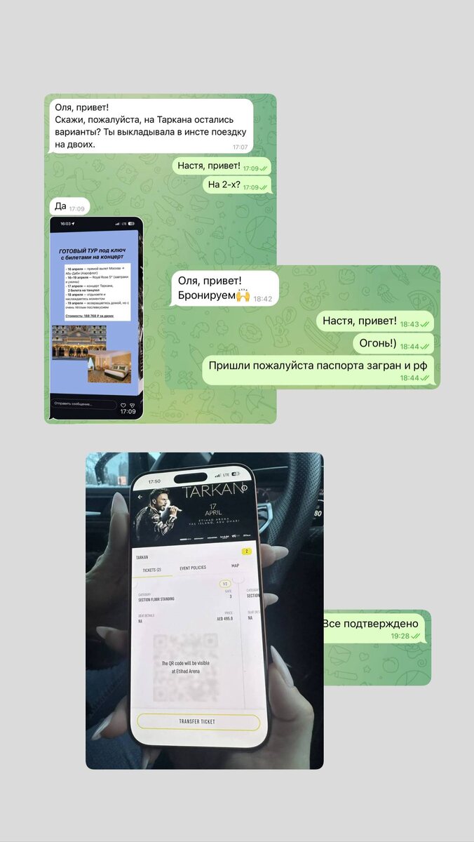 Оля, на Таркана ещё остались варианты? Ты выкладывала поездку на двоих… Отправляю программу. Пару уточнений. На следующий день: «Бронируем 👏» Я обожаю такие решения. Без долгих сомнений. Когда хочется — и делаем. 16 апреля — прямой рейс Москва → Абу-Даби. 17 апреля — Etihad Arena, танцпол, Таркан. 18 апреля — отдых и послевкусие. 19 апреля — домой с ощущением «это было мощно». Билеты на танцпол, отель Royal Rose 5*, всё подтверждено! И да, варианты ещё есть! 17 апреля можно быть в зале и танцевать!!! Если внутри тоже откликнулось — ставь ❤️ и напиши «Таркан», пришлем доступные варианты по билетам и отелям, а также подберем перелет из твоего города! 🔵 Для бронирования пишите нам в личные сообщения @goliktravel или в комментариях и мы сделаем для вас расчет! 📱 telegram 📲 MAX наш номер +7 995 839 15 85 Ⓜ️ Подписывайтесь на наш канал в MAX