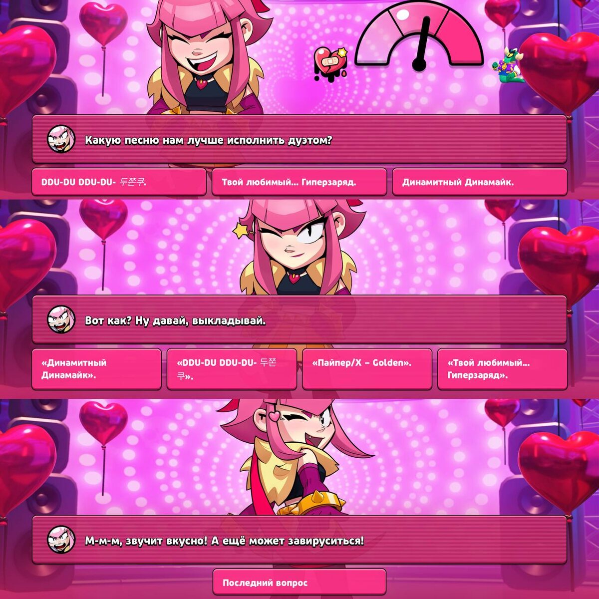 На сегодняшний финальный вопрос, вероятно, правильным ответом является реплика «DDU-DU DDU-DU- 두쫀쿠». Если выполнить комбинацию из реплик под номерами 2-1-3-2-2, то Мелоди будет довольна, услышав эту песню. Легчайший легендарный скин, вроде как. ✅Новости по Clash Royale - ТЫК 💬Новости по Roblox - ТЫК Мир Supercell. Подписаться