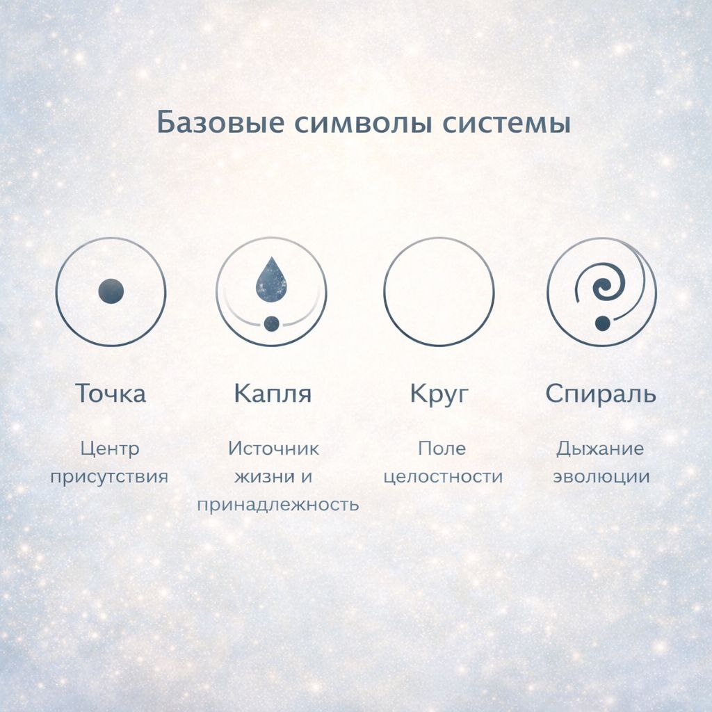 12 Ключей — это не только состояния и практики. Это система символов, которые отражают развитие сознания. Геометрия усложняется от цикла к циклу, но центр остаётся неизменным. В каждом символе присутствуют три базовых элемента: Точка — Дух, центр присутствия. Капля — Душа, живая часть человека. Круг — Тело как Храм, форма проявления. Эти элементы сохраняются во всех 12 Ключах. Меняется только уровень движения и форма процесса. Четвертый базовый элемент - Спираль. Спираль внутри одного цикла проще понять через дыхание. Каждый из 4 х циклов 12 Ключей Лемурии имеет 3 фазы— вдох, выдох и пауза. Первый Ключ цикла — вдох Спираль появляется и начинает движение по часовой стрелке. Это вдох процесса. Сознание раскрывается. Возникает импульс. Внимание собирается и входит в движение. Это расширение и наполнение. Второй Ключ цикла — выдох Спираль меняет направление. Это выдох. Происходит ответ. Идёт переработка и преобразование. То, что вошло на вдохе, проходит через опыт. Это движе