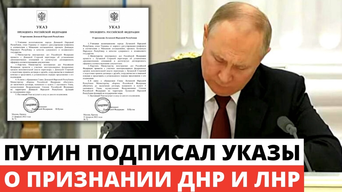 - 21 февраля 2022 года Владимир Путин заявил, что Россия признала независимость Донецкой и Луганской народных республик (ДНР и ЛНР). В этот день президент России подписал указы о признании Донецкой и Луганской народных республик (ДНР и ЛНР), а также договоры о дружбе, сотрудничестве и взаимопомощи с республиками. (см. видео)