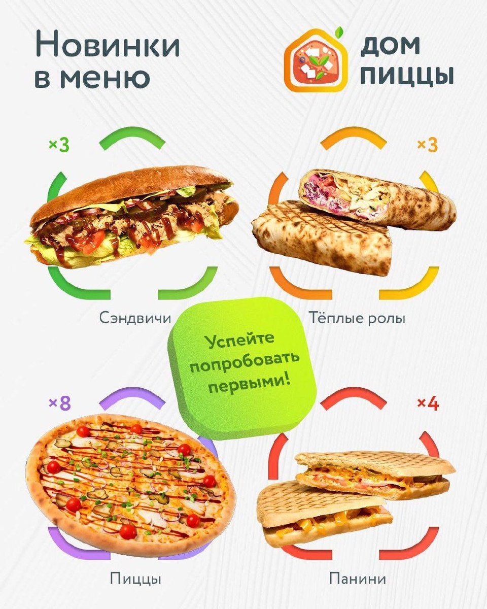 ! И это не просто новые позиции — это настоящее гастро-перезагружение 🔥 🍕 Яркие пиццы 🥖 Горячие панини 🥪 Сочные сэндвичи 🌯 Тёплые роллы Больше вкуса, больше начинки, больше поводов заглянуть к нам! 🎁 С 21 по 23 февраля каждый день разыгрываем новинки из меню — победителей ждёт много вкусного! Присоединяйтесь! Приходите пробовать первыми. 📍 Ждём вас в «Дом пиццы»!